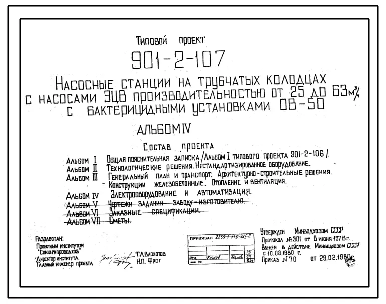 Типовой проект 901-2-107 Насосные станции на трубчатых колодцах с насосами ЭЦВ производительностью от 25 до 63 м3/ч и бактерицидными установками ОВ-50