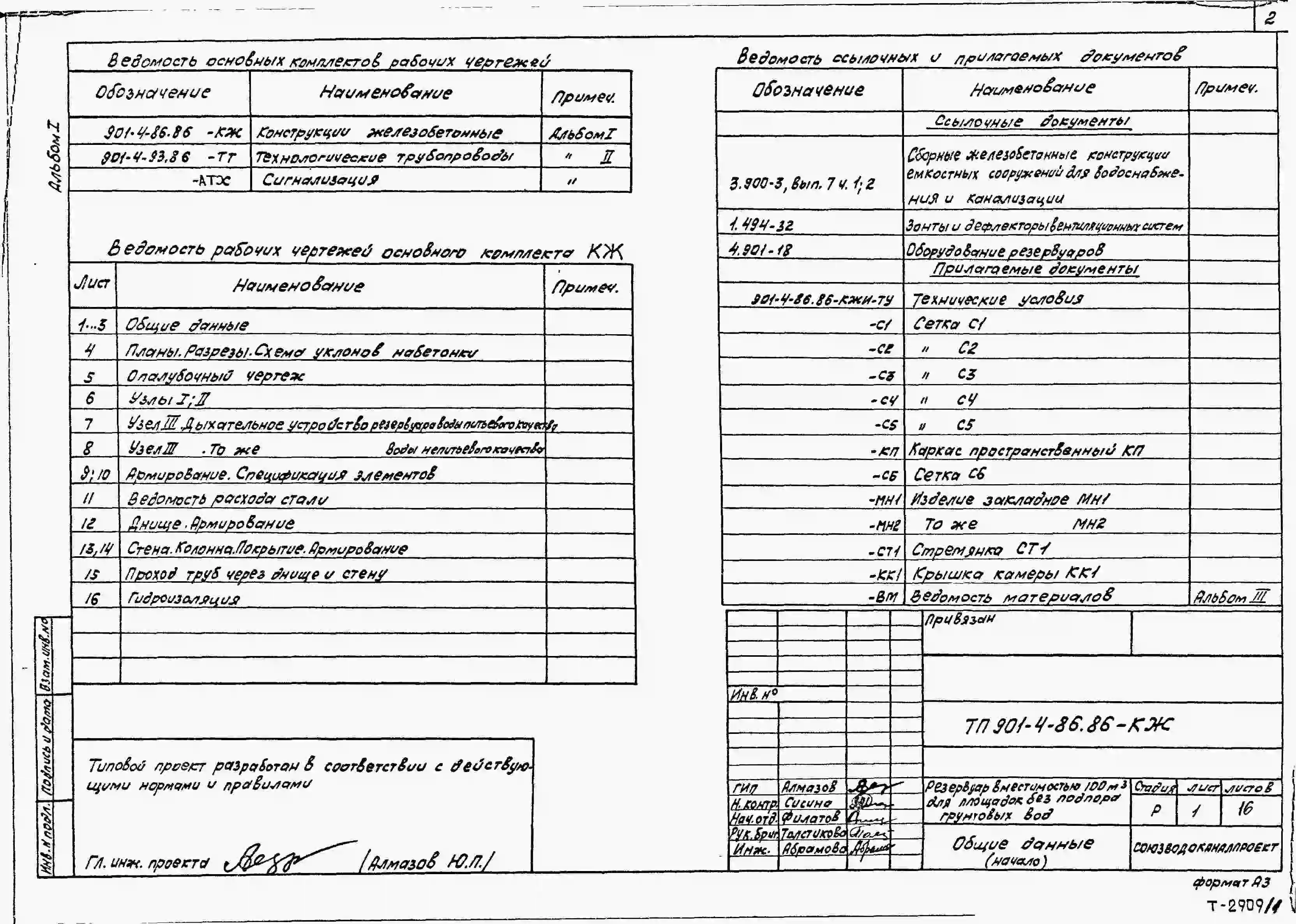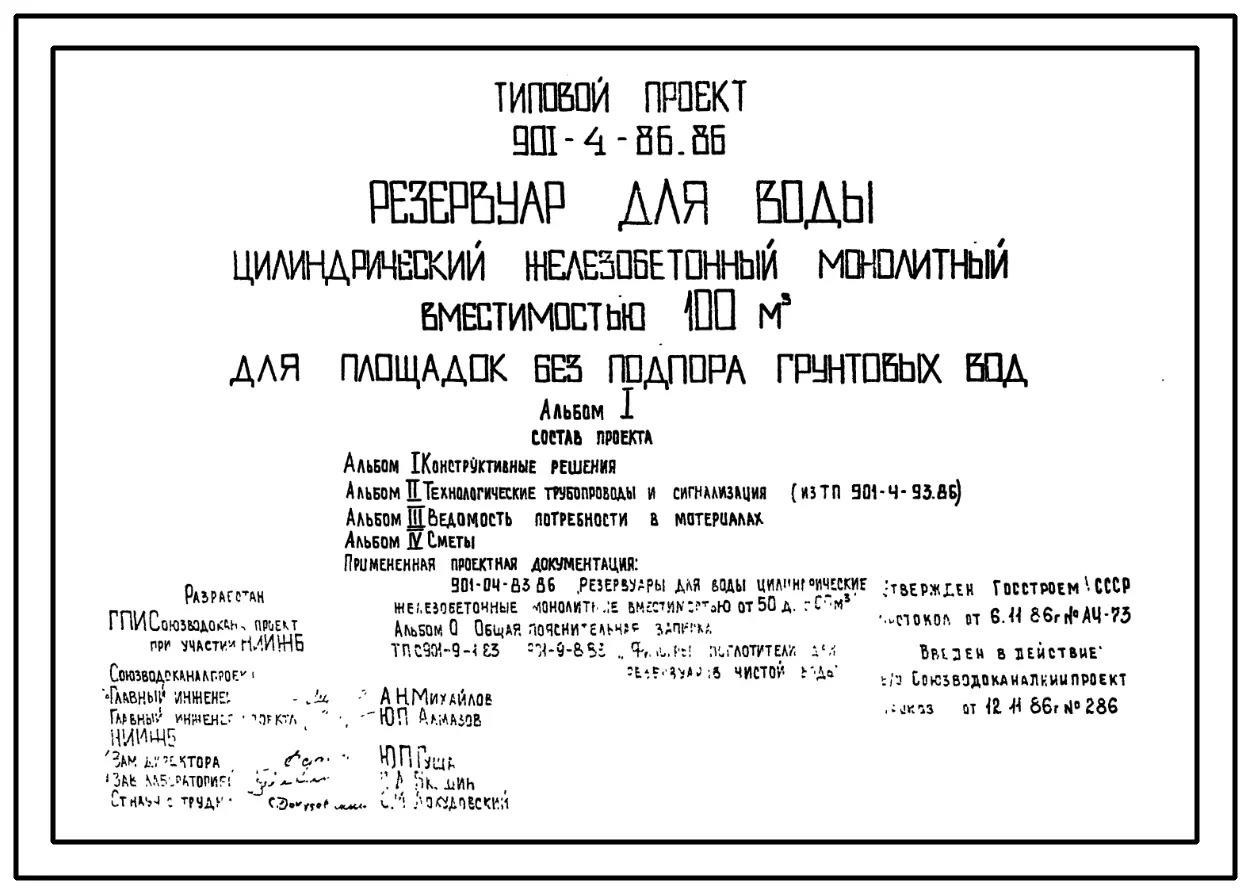 Типовой проект 901-4-86.86 РЕЗЕРВУАР ДЛЯ ВОДЫ ЦИЛИНДРИЧЕСКИЙ ЖЕЛЕЗОБЕТОННЫЙ МОНОЛИТНЫЙ ВМЕСТИМОСТЬЮ 100 М3 ДЛЯ ПЛОЩАДОК БЕЗ ПОДПОРА ГРУНТОВЫХ ВОД.