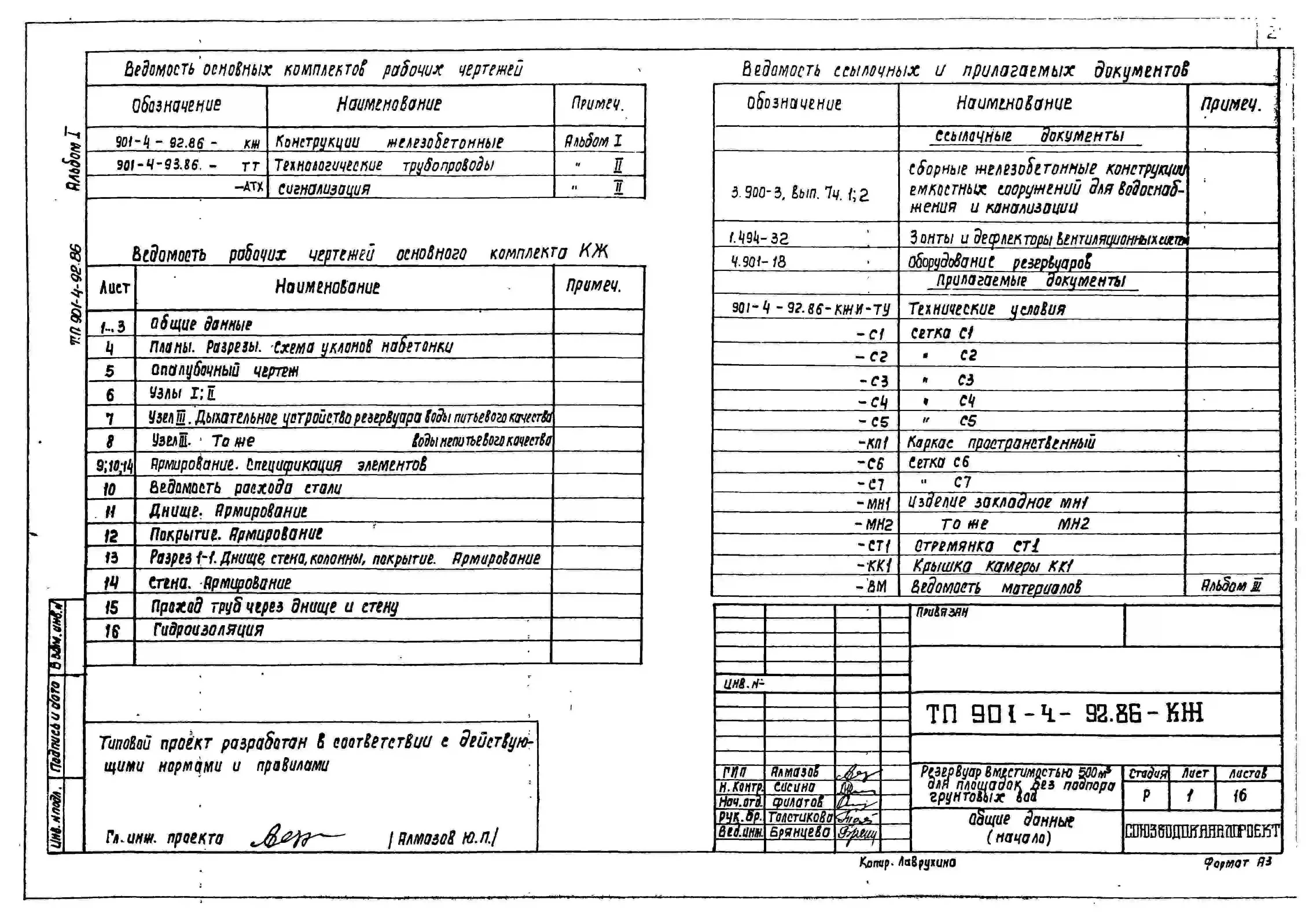 Типовой проект 901-4-92.86 РЕЗЕРВУАР ДЛЯ ВОДЫ ЦИЛИНДРИЧЕСКИЙ ЖЕЛЕЗОБЕТОННЫЙ МОНОЛИТНЫЙ ВМЕСТИМОСТЬЮ 500 М3 ДЛЯ ПЛОЩАДОК БЕЗ ПОДПОРА ГРУНТОВЫХ ВОД.