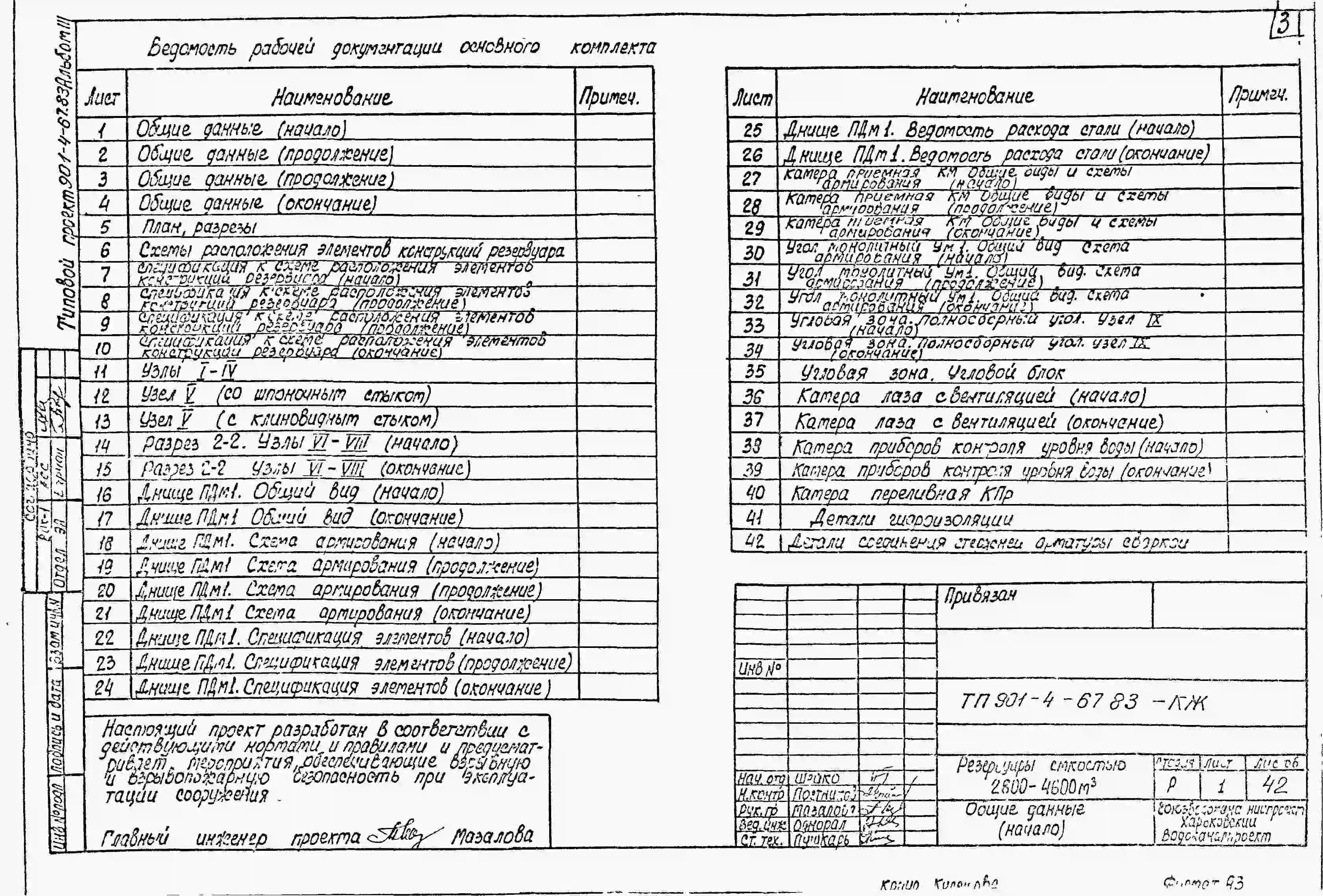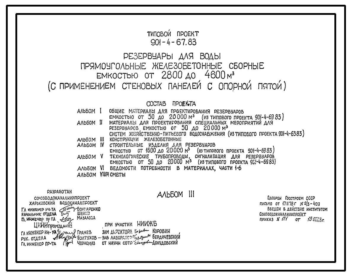 Типовой проект 901-4-67.83 Резервуары для воды прямоугольные железобетонные сборные емкостью от 2800 до 4600 м3 (с применением стеновых панелей с опорой пятой)