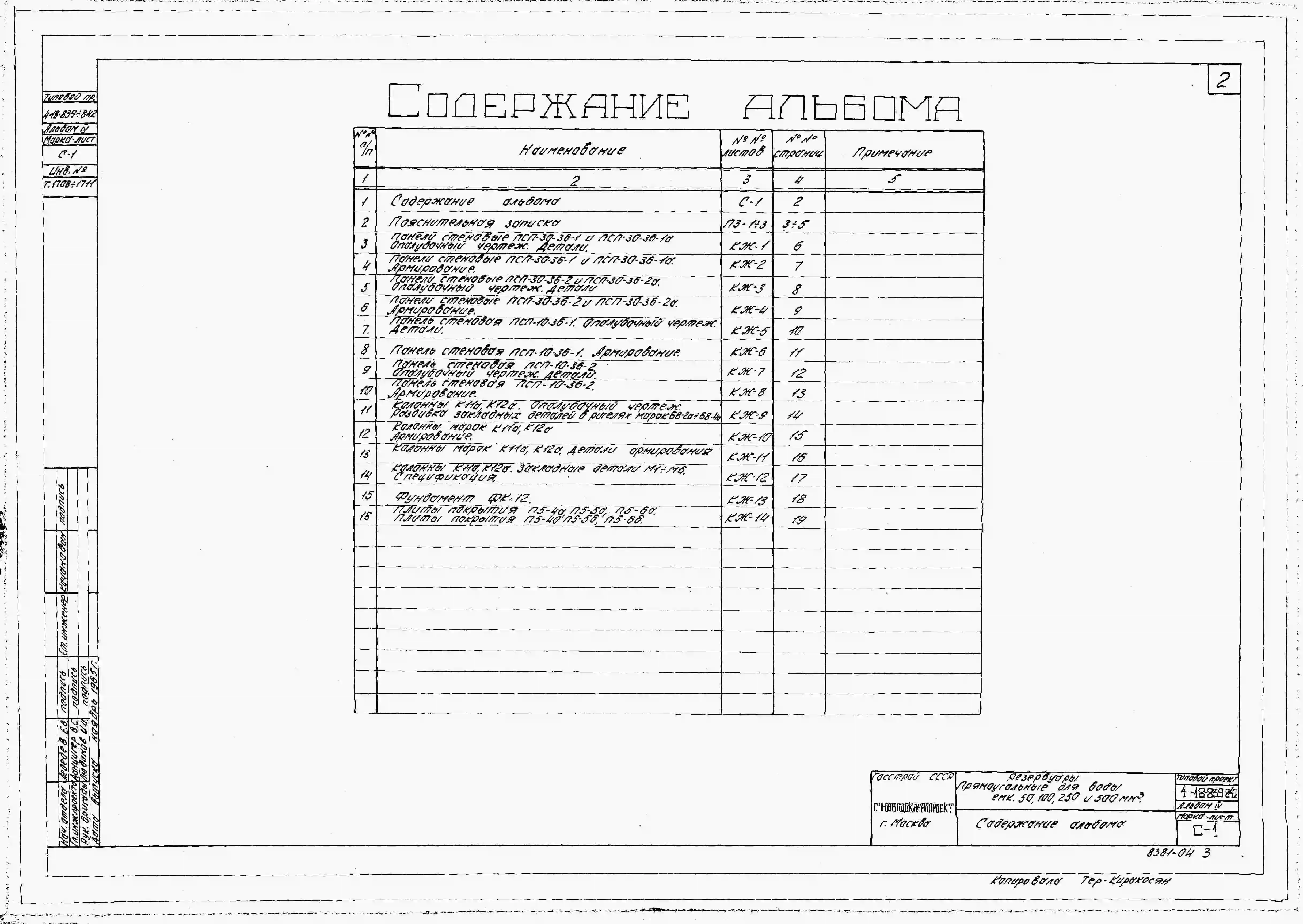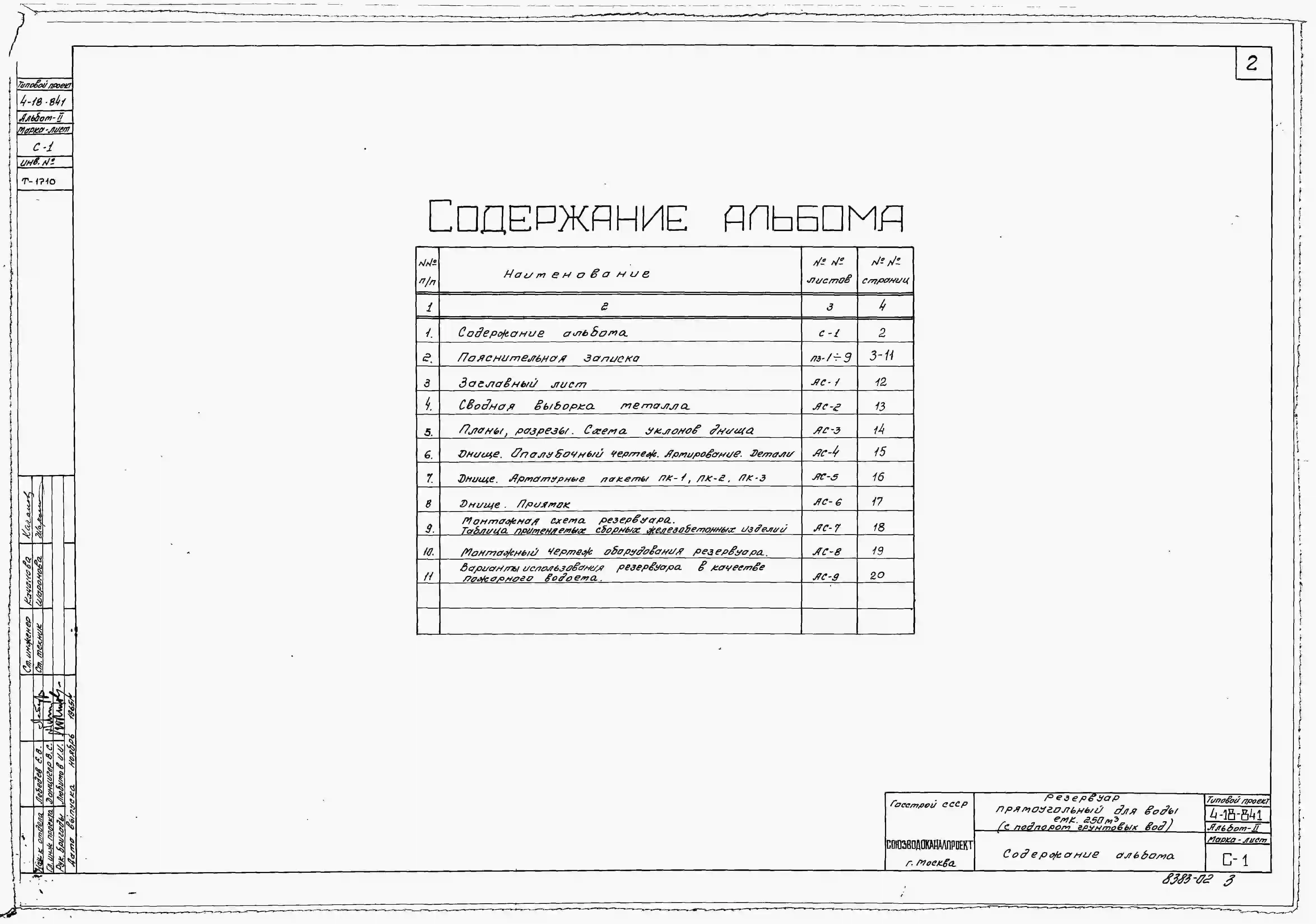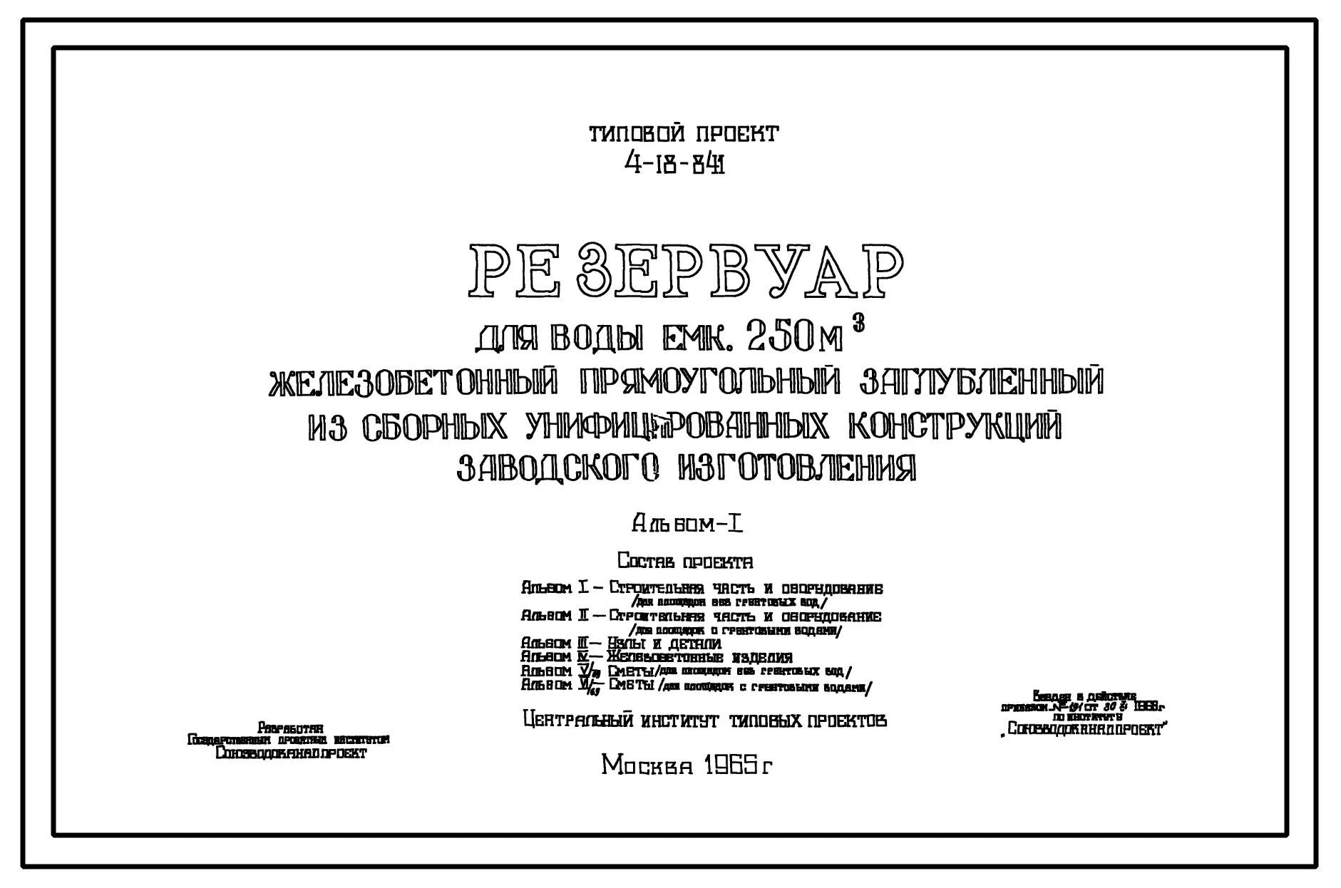 Типовой проект 4-18-841 Резервуар для воды емкостью 250 м.куб. железобетонный прямоугольный заглубленный из сборных унифицированных конструкций заводского изготовления