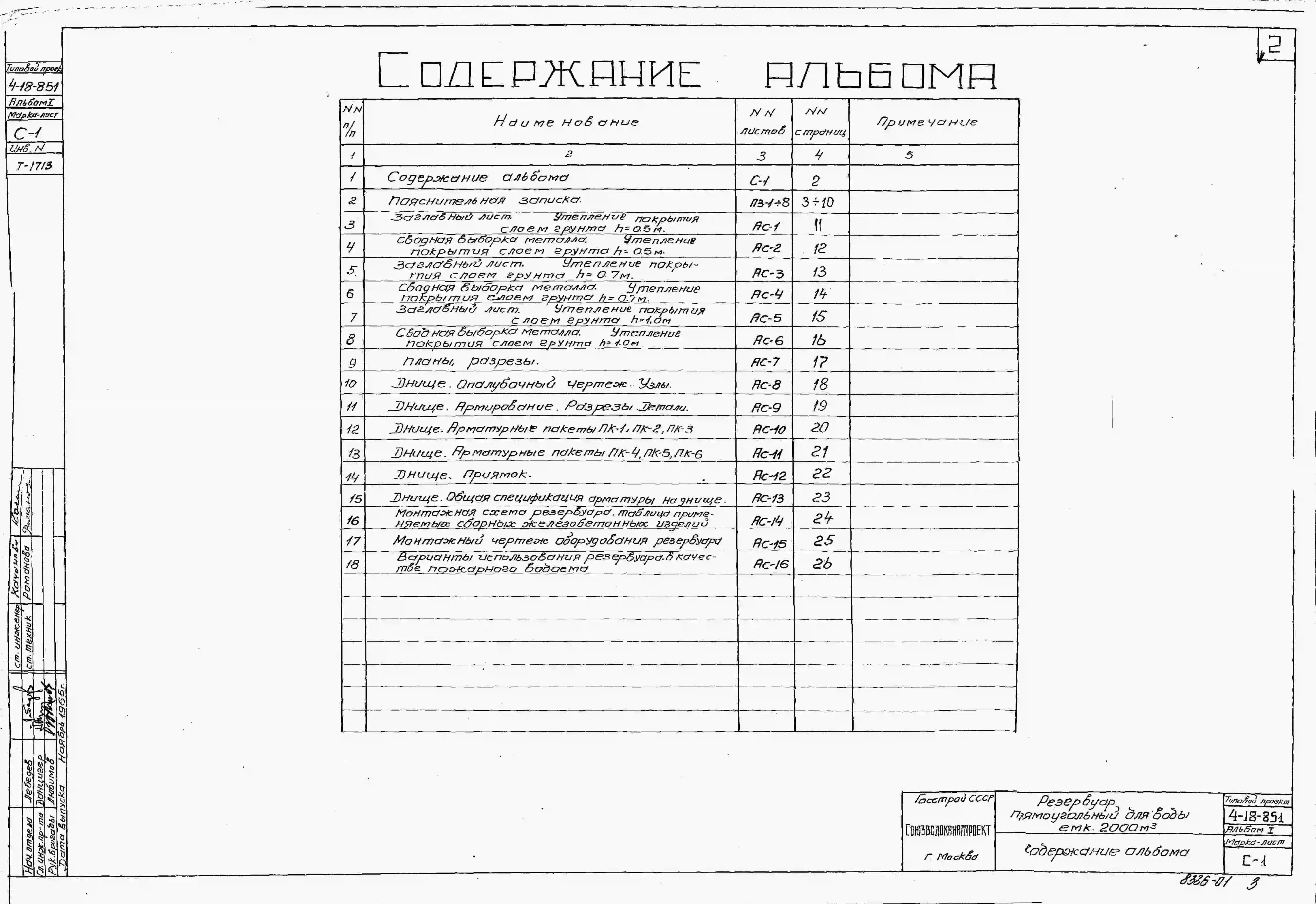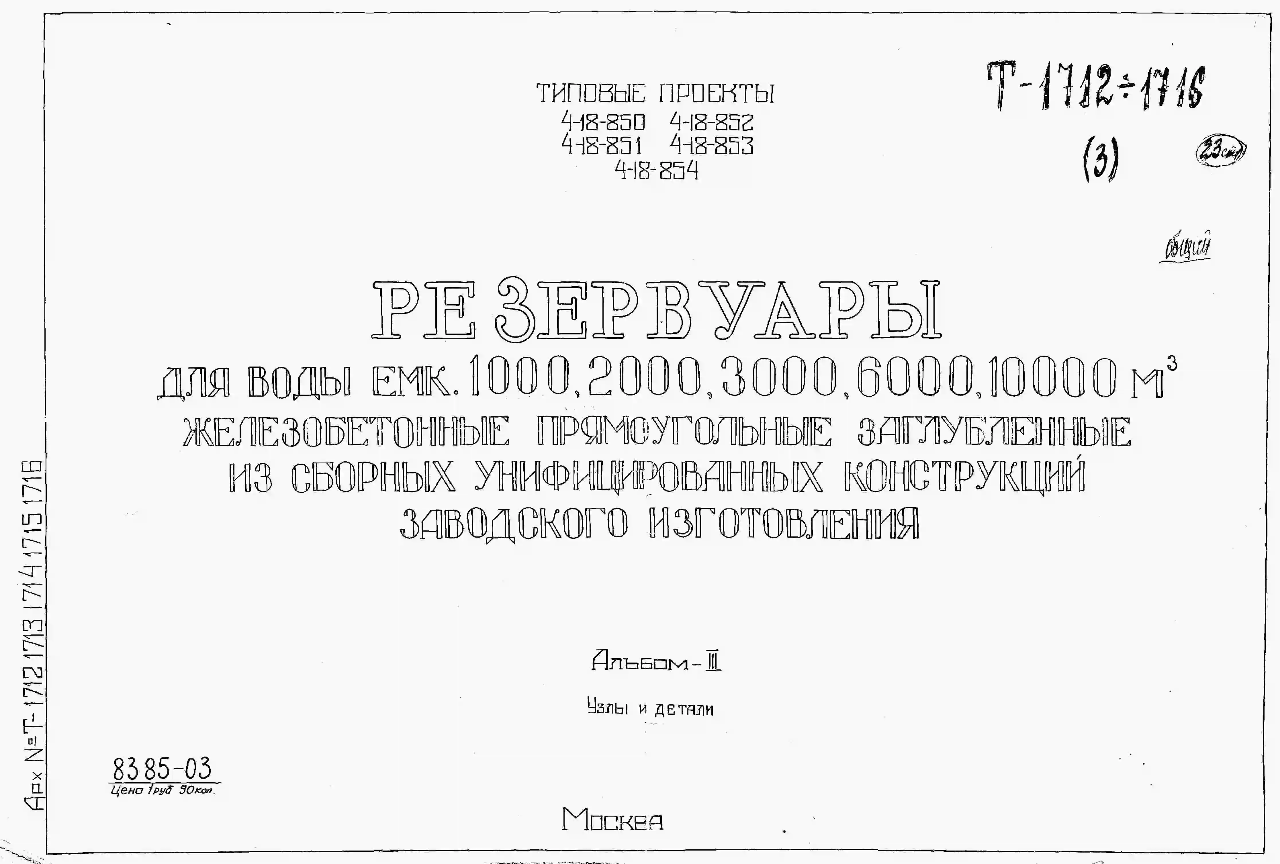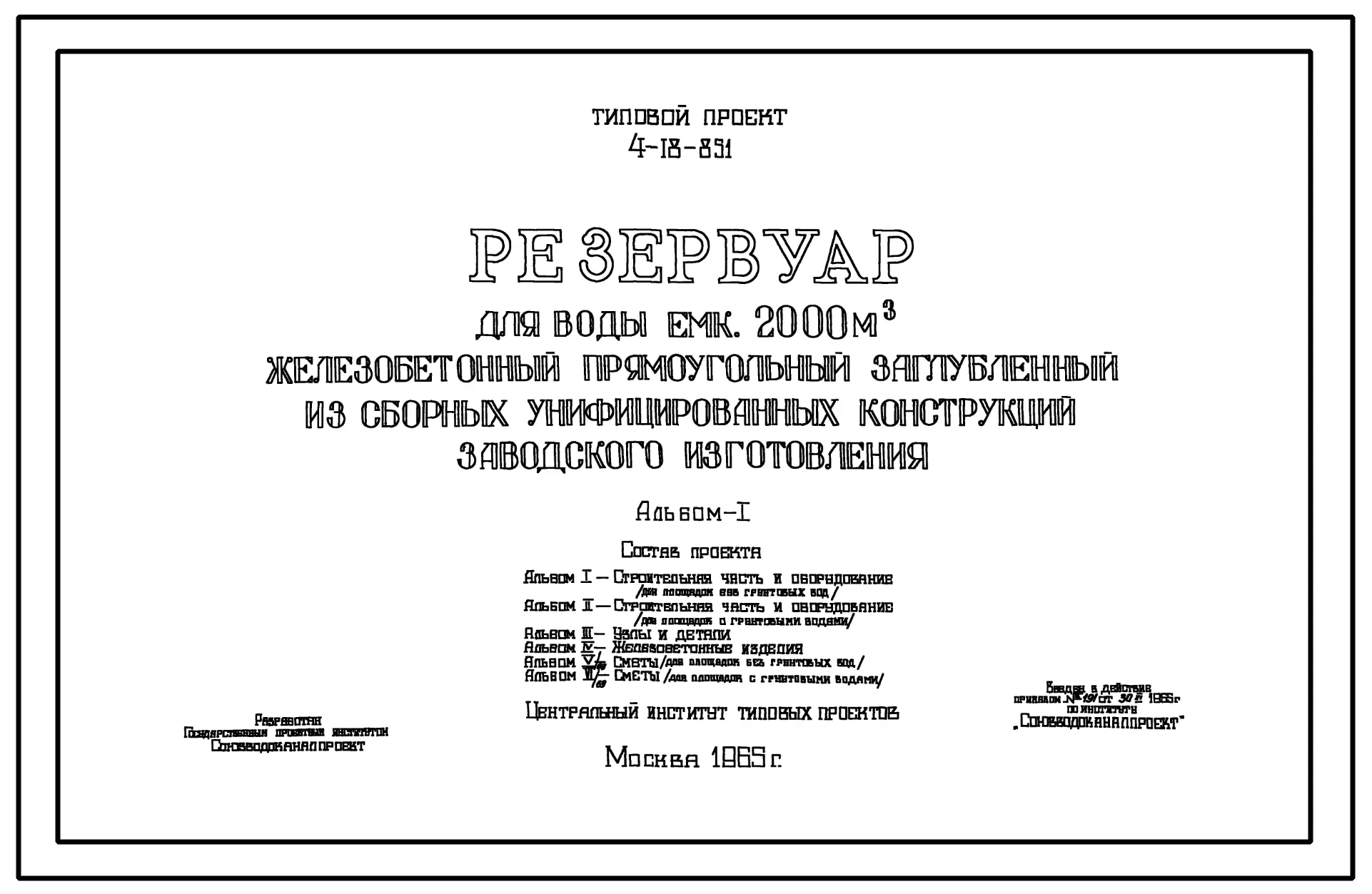Типовой проект 4-18-851 Резервуар для воды емкостью 2000 м.куб. железобетонный прямоугольный заглубленный из сборных унифицированных конструкций заводского изготовления