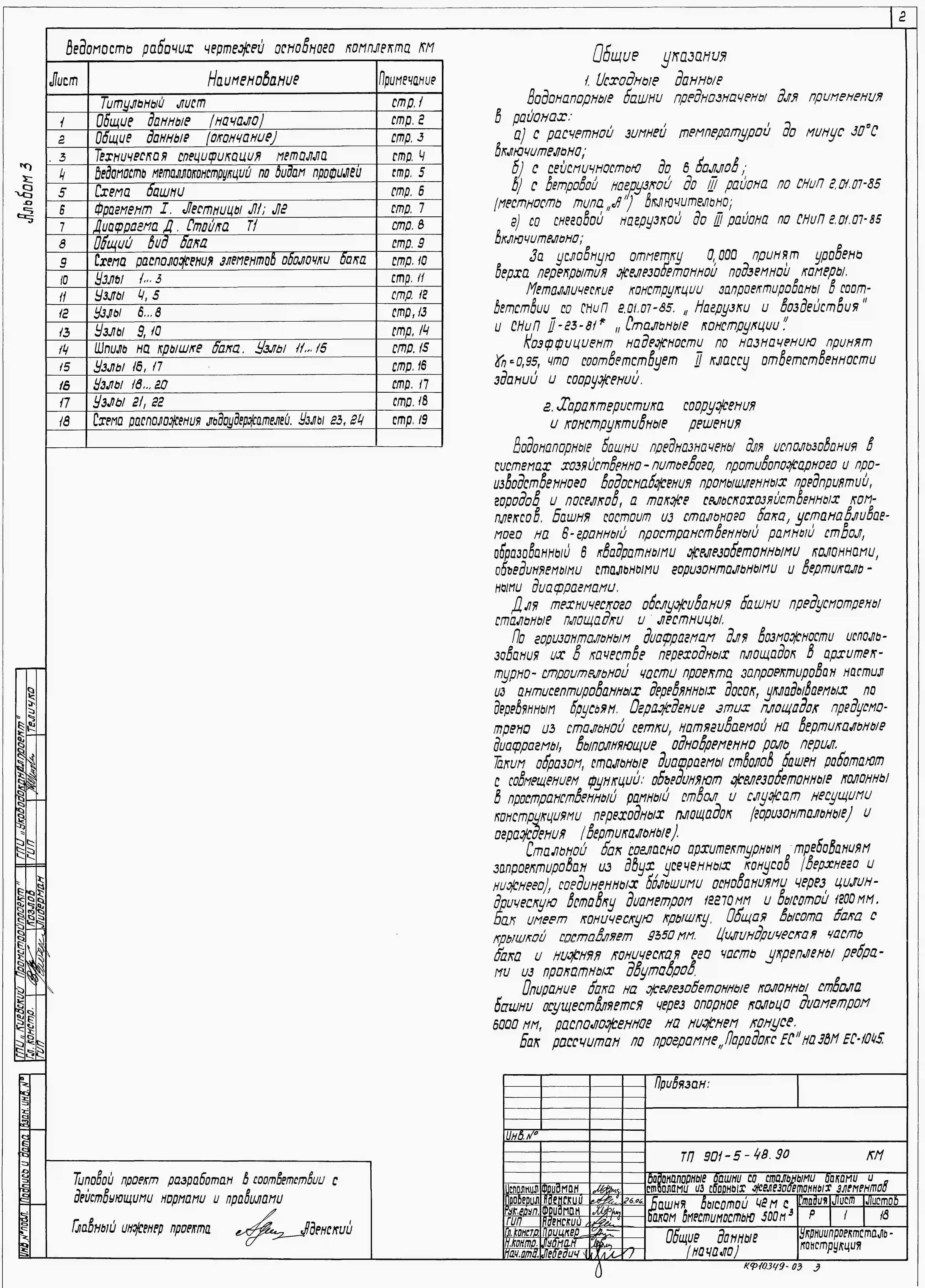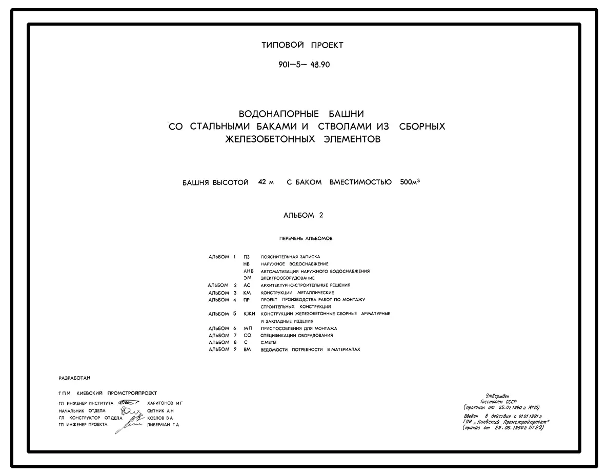 Типовой проект 901-5-48.90 Водонапорные башни со стальными баками и стволами из сборных железобетонных элементов башня высотой 42 м с баком вместимостью 500 м3