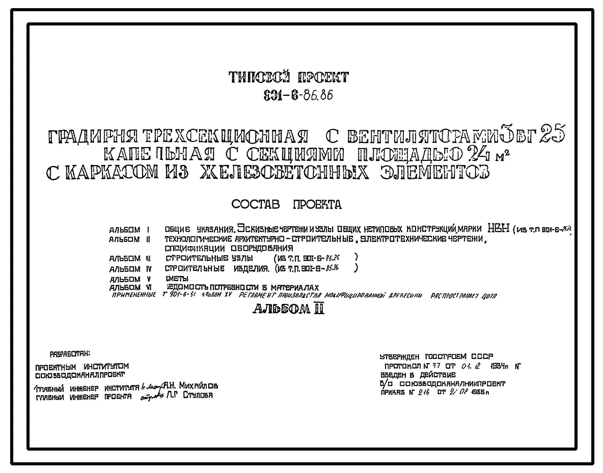 Типовой проект 901-6-86.86 Градирня трехсекционная с вентиляторами 3ВГ25 капельная с секциями площадью 24 кв. м с каркасом из железобетонных элементов