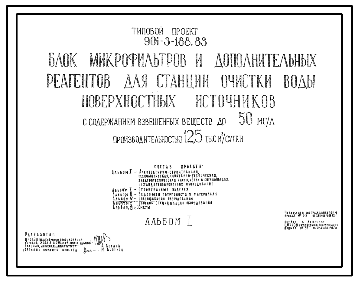 Типовой проект 901-3-188.83 Блок микрофильтров и дополнительных реагентов для станции очистки воды поверхностных источников с содержанием взвешенных веществ до 50 мг/л производительностью 12,5 тыс. м3/сут