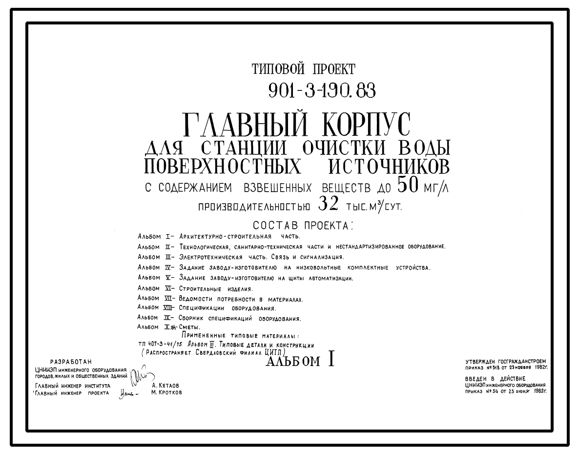 Типовой проект 901-3-190.83 Главный корпус для станции очистки воды поверхностных источников с содержанием взвешенных веществ до 50 мг/л производительностью 32 тыс. м3/сут