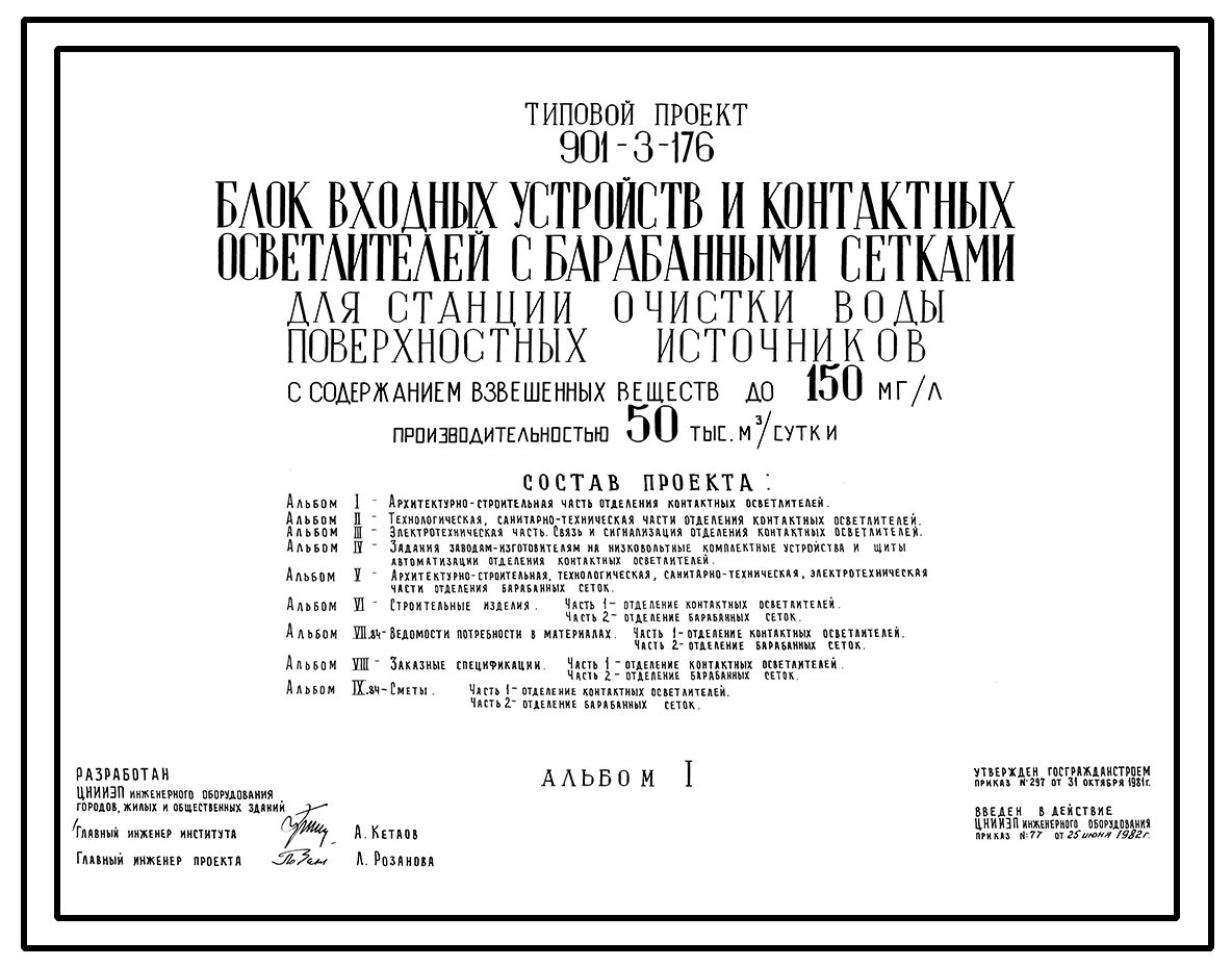 Типовой проект 901-3-176 Блок входных устройств и контактных осветлителей с барабанными сетками для станции очистки воды поверхностных источников с содержанием взвешенных веществ до 150 мг/л производительностью 50 тыс. м3/сут