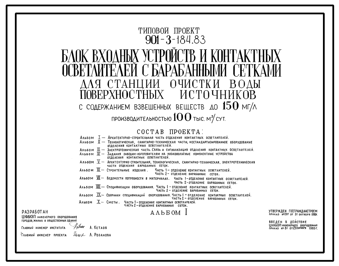 Типовой проект 901-3-184.83 Блок входных устройств и контактных осветлителей с барабанными сетками для станции очистки воды поверхностных источников с содержанием взвешенных веществ до 150 мг/л производительностью 100 тыс. м3/сут
