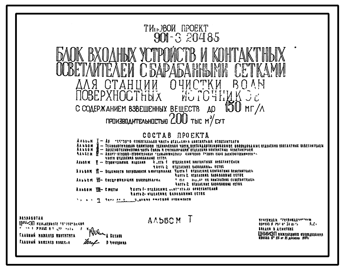Типовой проект 901-3-204.85 Блок входных устройств и контактных осветлителей с барабанными сетками для станции очистки воды поверхностных источников с содержанием взвешенных веществ до 150 мг/л производительностью 200 тыс. м3/сут