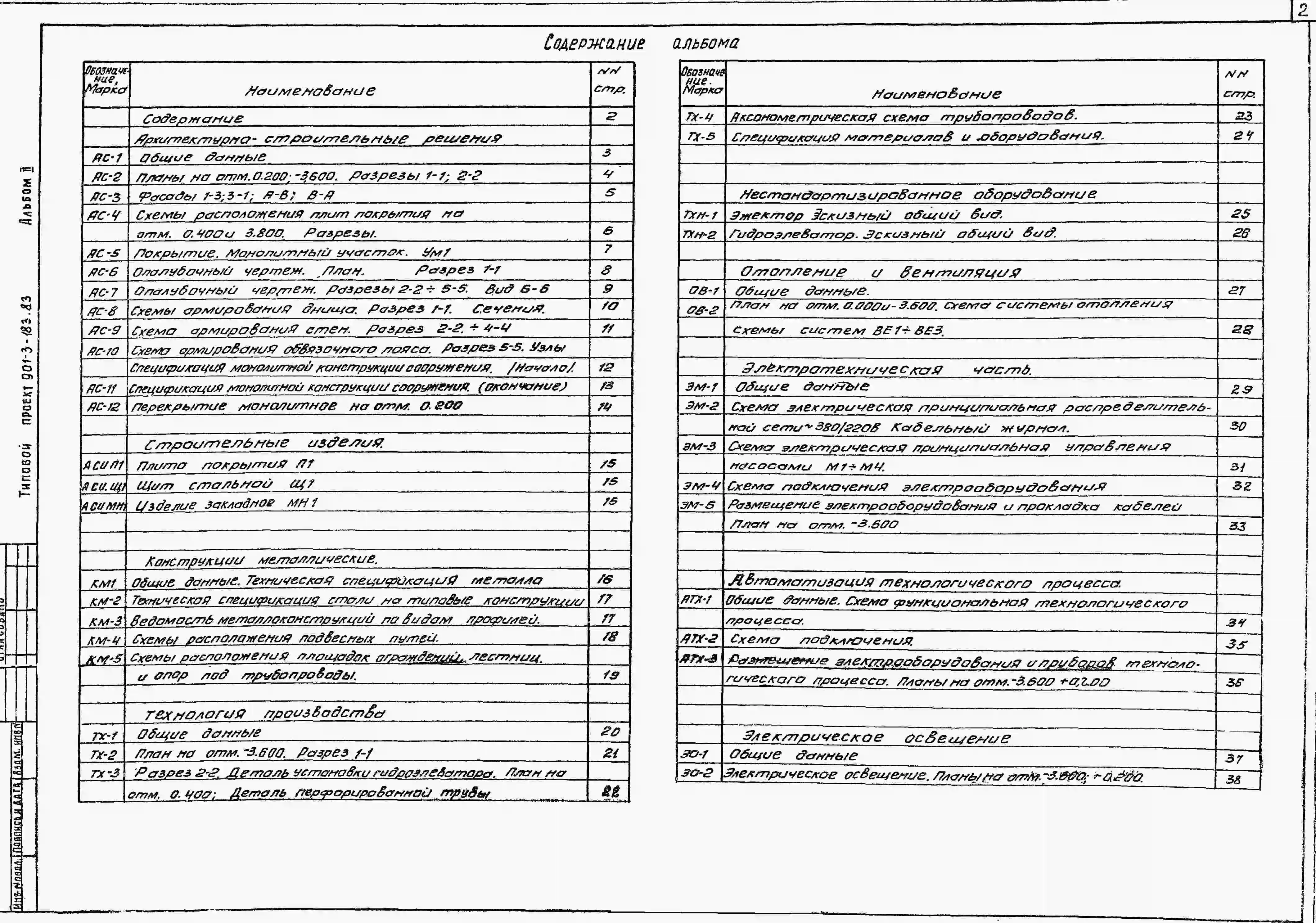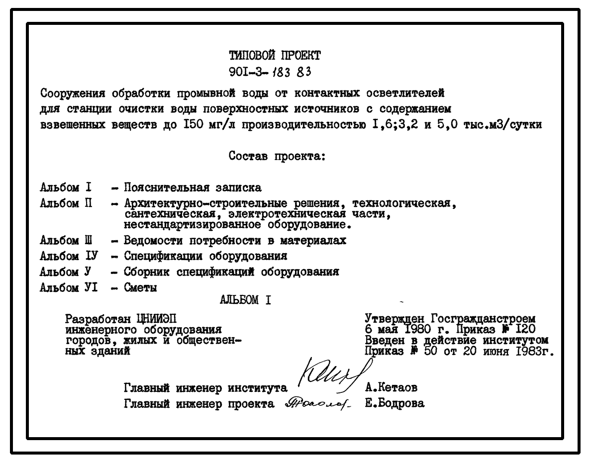 Типовой проект 901-3-183.83 Сооружения обработки промывной воды от контактных осветлителей для станции очистки воды поверхностных источников с содержанием взвешенных веществ до 150 мг/л производительностью 1,6; 3,2 и 5,0 тыс. м3/сут