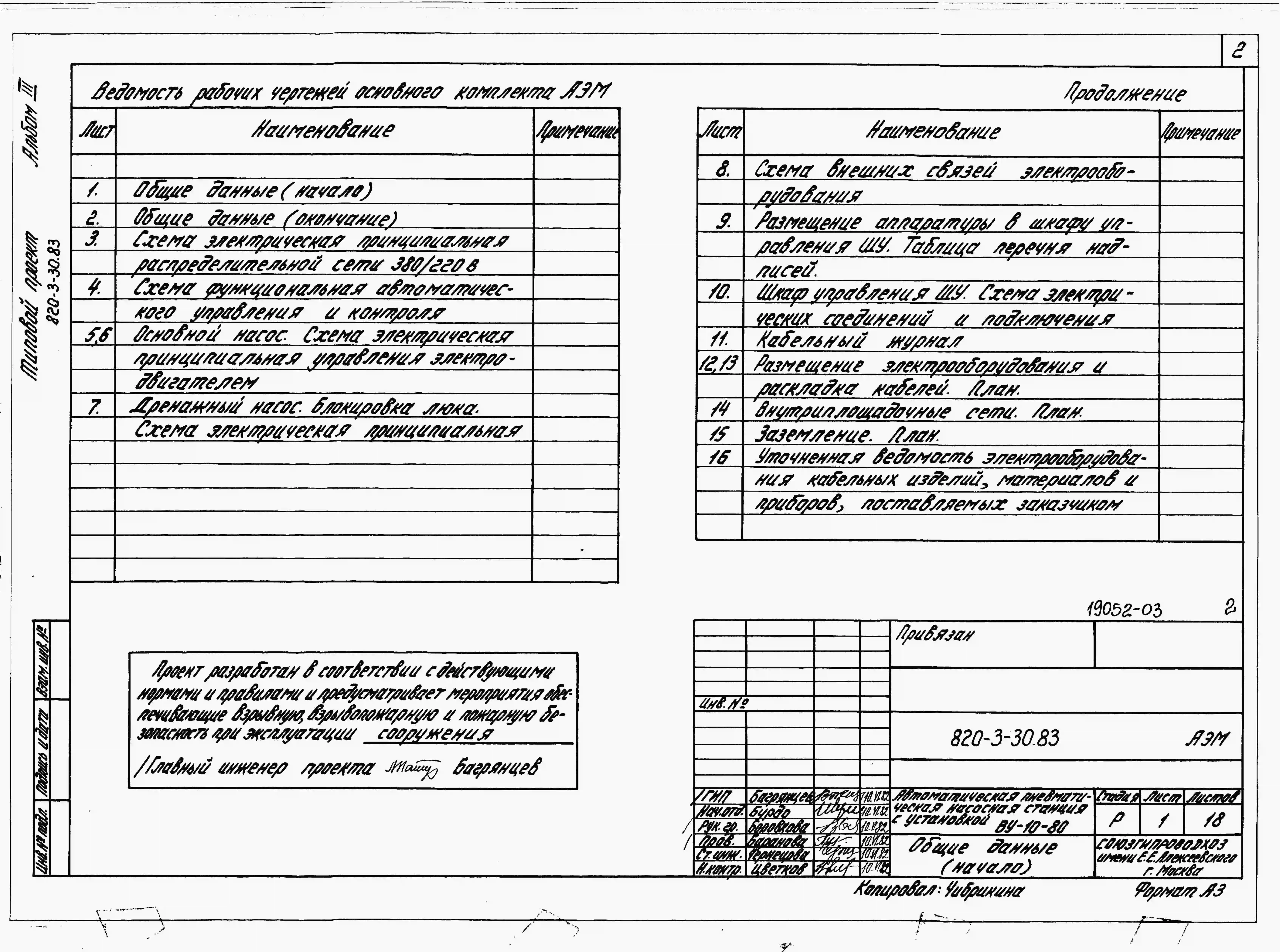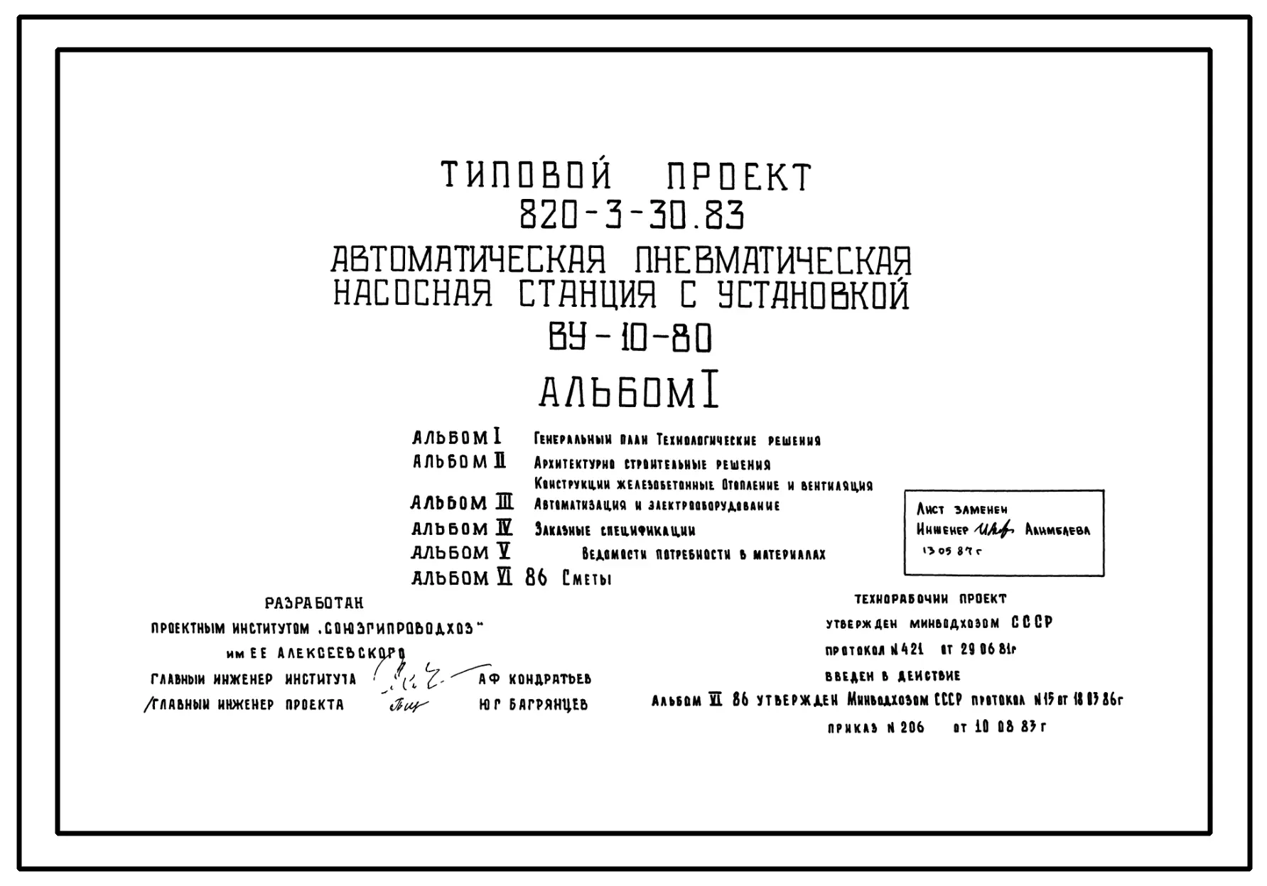 Типовой проект 820-3-30.83 Автоматическая пнематическая насосная станция с установкой ВУ-10-80