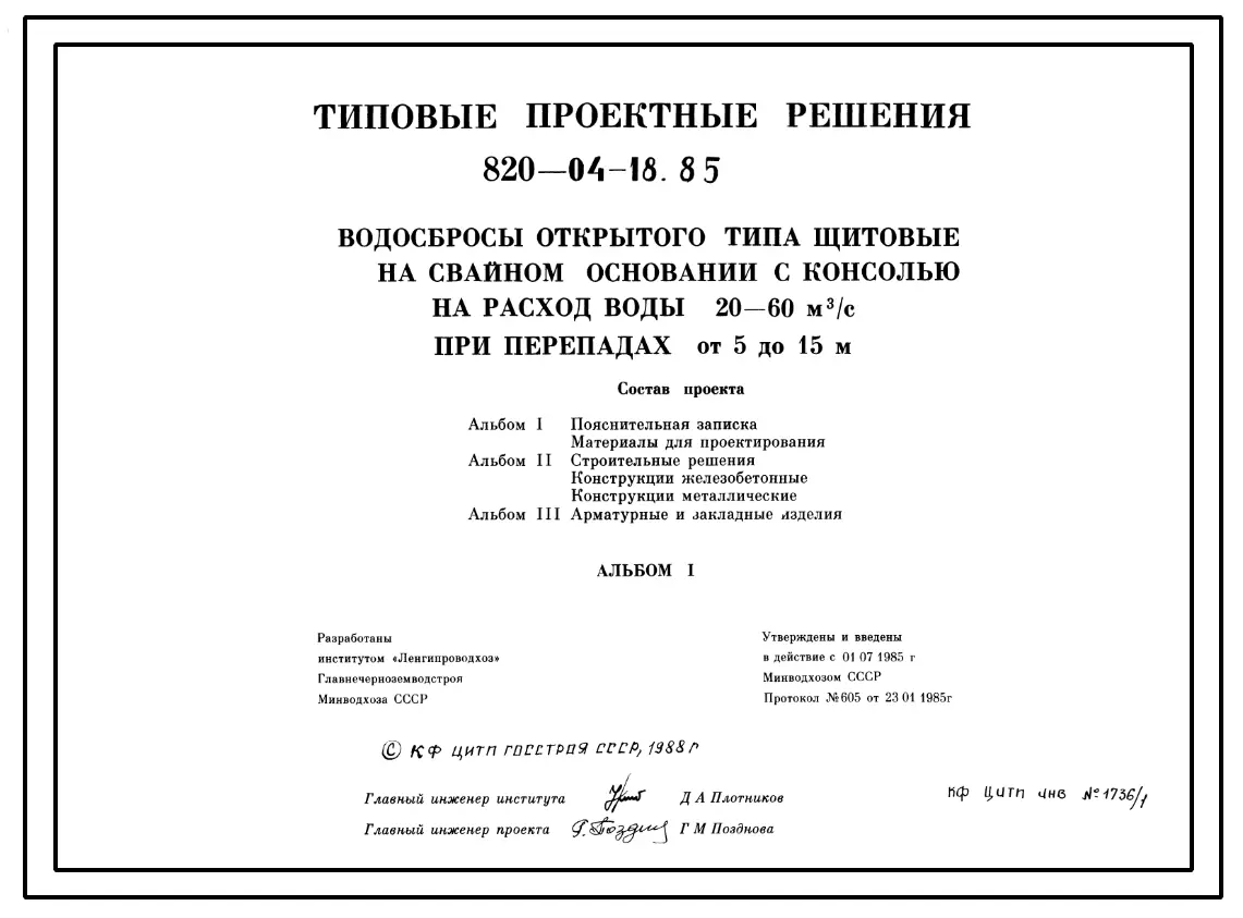 Типовой проект 820-04-18.85 Водосбросы открытого типа щитовые на свайном основании с консолью на расход воды 20-60 м.куб/с при перепадах от 5 до 15 м