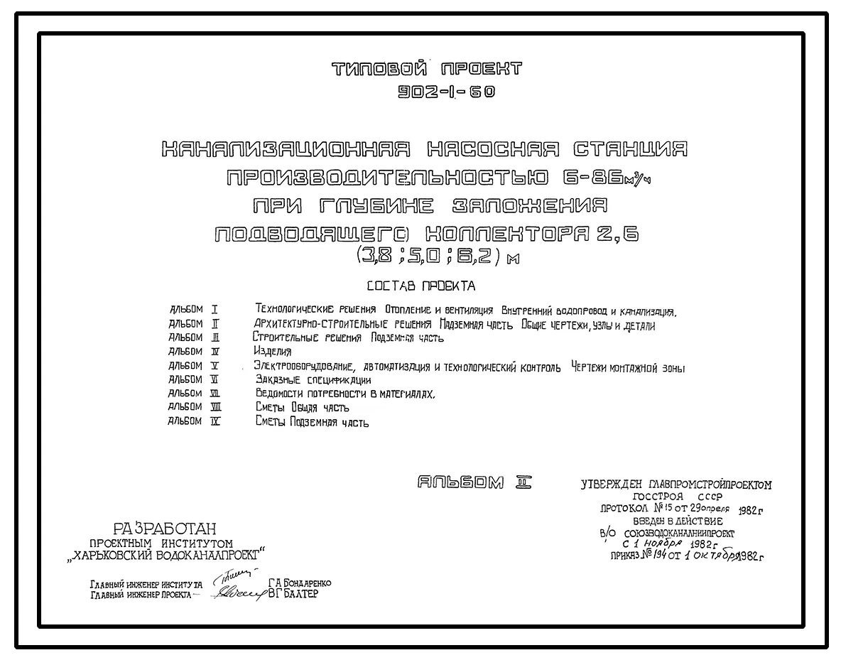 Типовой проект 902-1-60 Канализационная насосная станция производительностью 6 - 86 куб. м/ч при глубине заложения подводящего коллектора 2,6 м (3,8; 5,0; 6,2) м