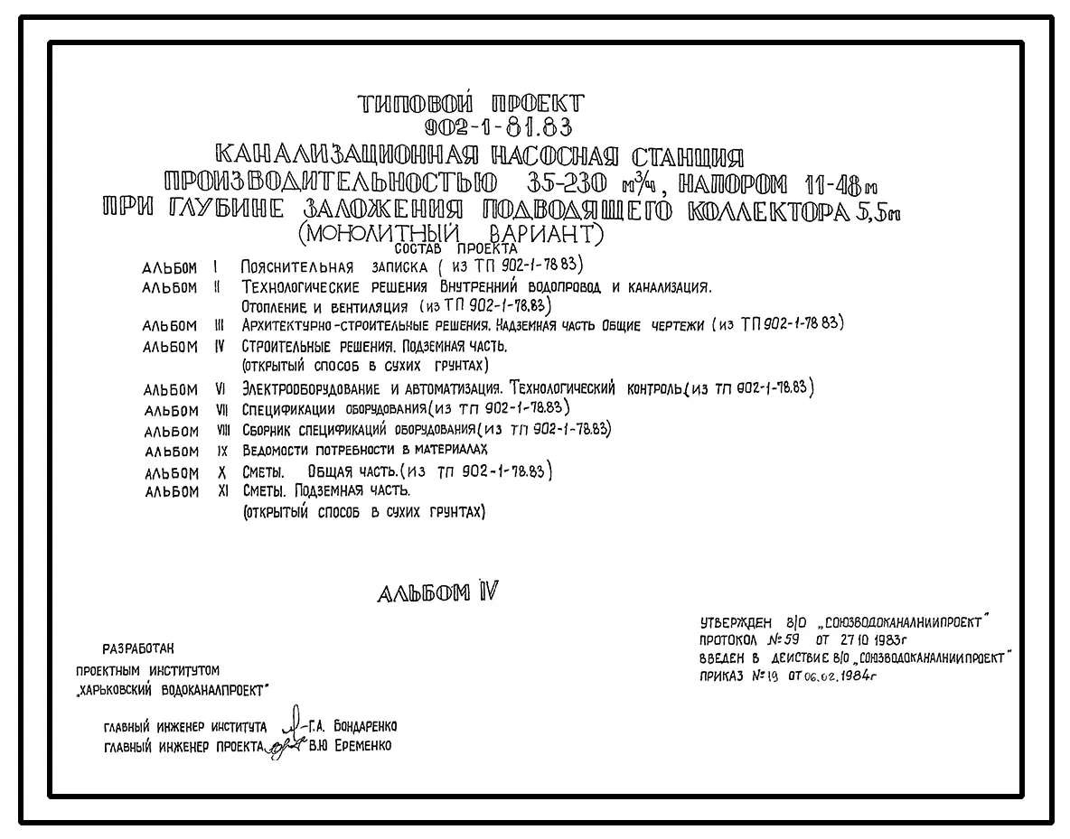 Типовой проект 902-1-81.83 Канализационная насосная станция производительностью 35 - 230 куб. м/ч, напором 11 - 48 м при глубине заложения подводящего коллектора 5,5 м (монолитный вариант)