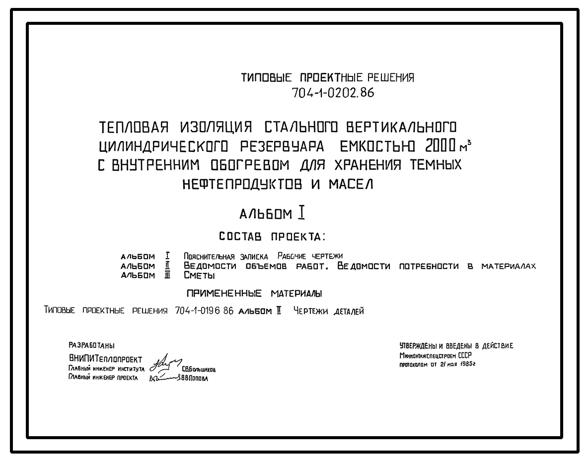 Типовой проект 704-1-0202.86 Тепловая изоляция стального вертикального цилиндрического резервуара емкостью 2000 м. куб с внутренним обогревом для хранения темных нефтепродуктов и масел