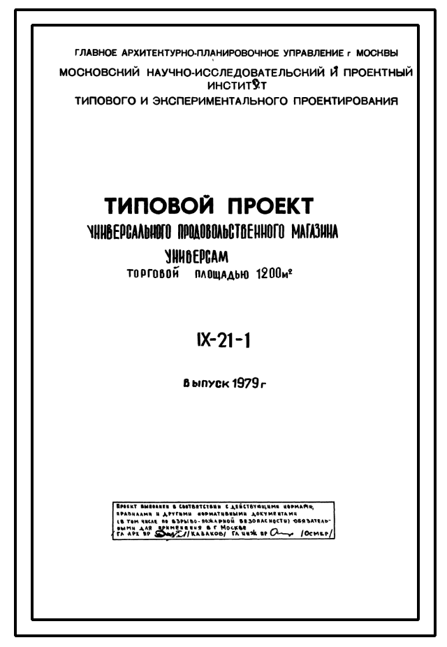 Типовой проект IX-21-1 Универсальный продовольственный магазин «Универсам» общей торговой площадью 1200 м.кв. выпуск 1979 года. Для строительства в г.Москве