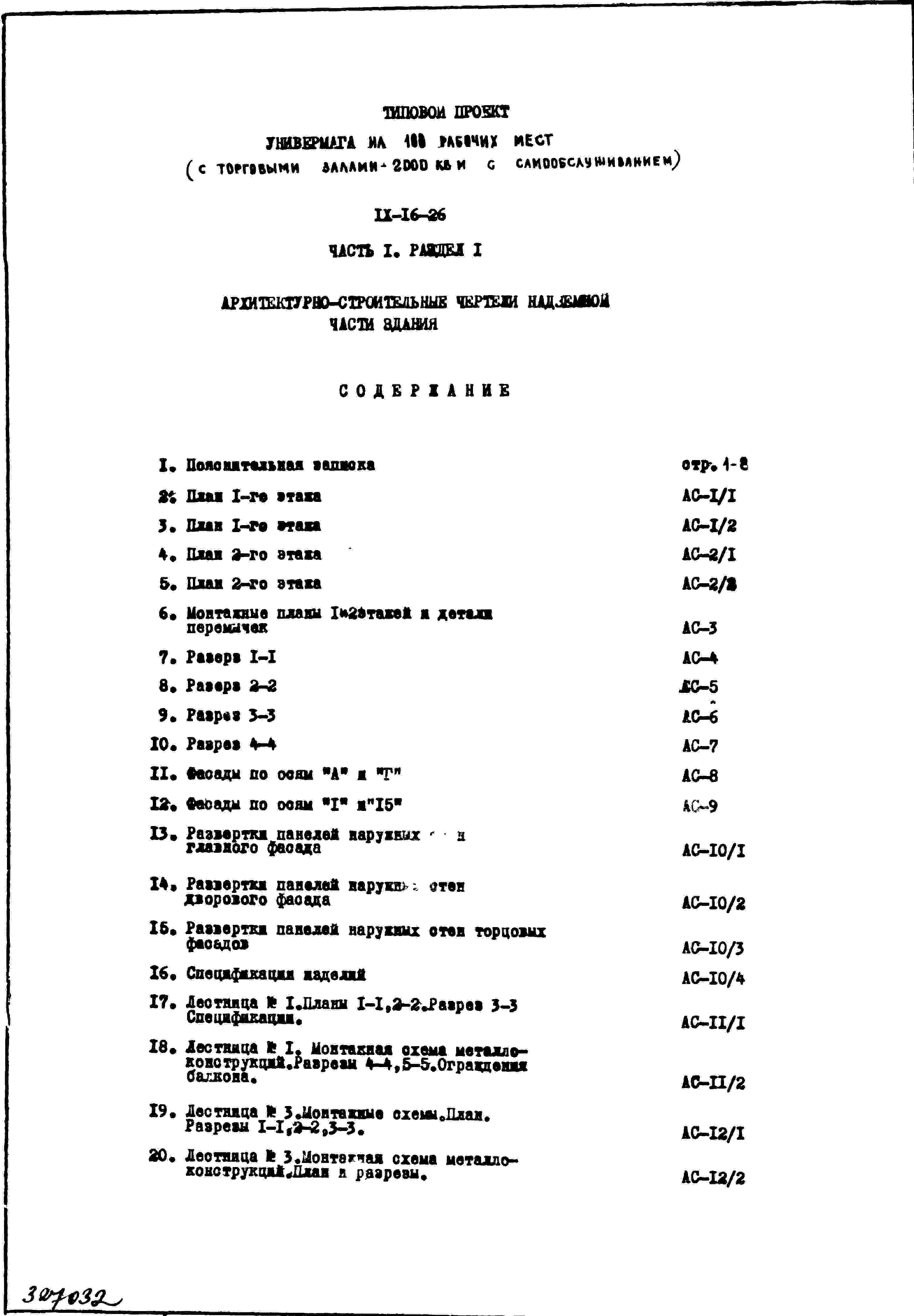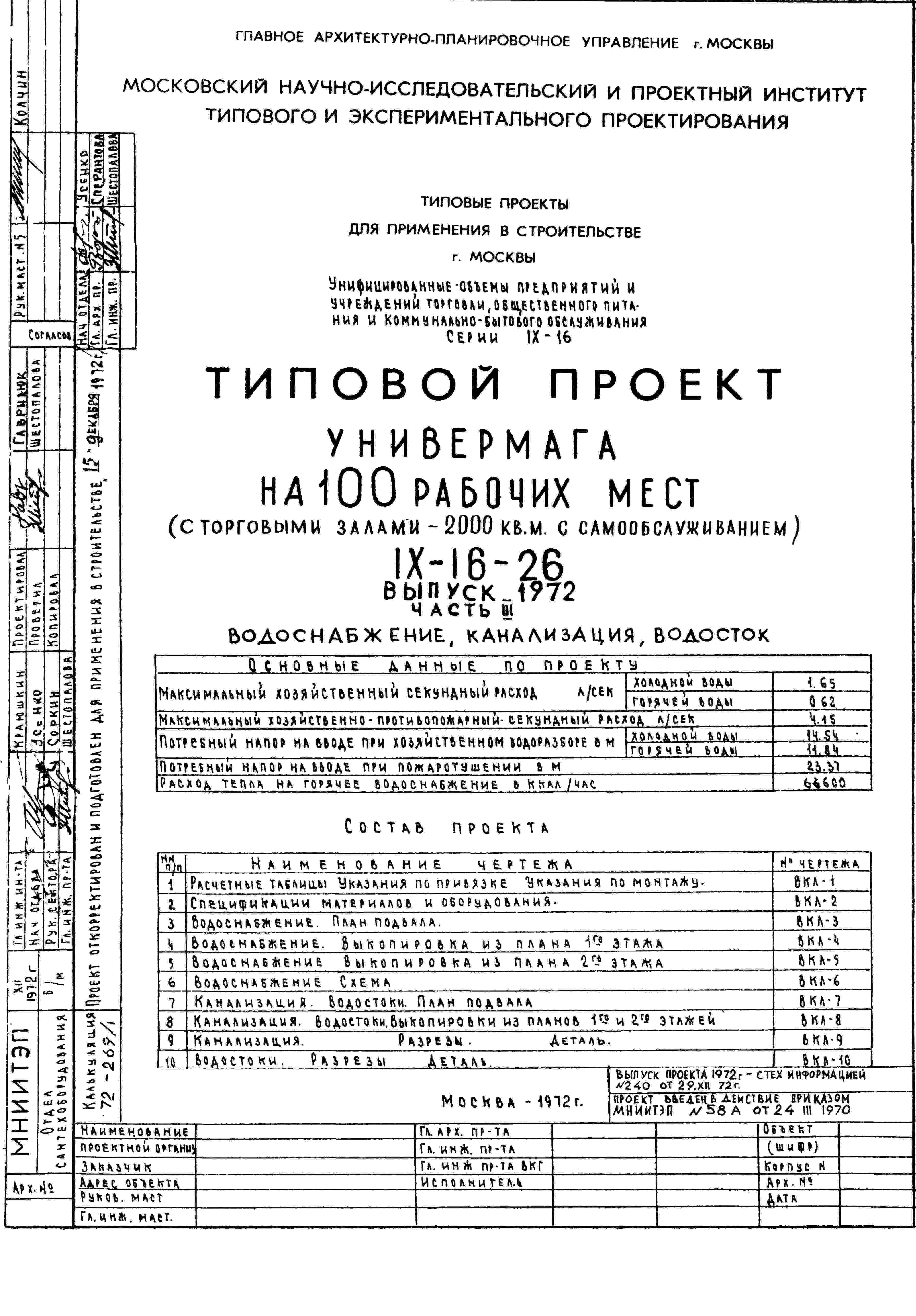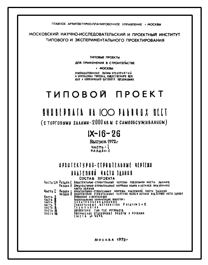 Типовой проект IX-16-26 Универмаг на 100 рабочих мест продовольственного магазина на 45 условных рабочих мест и промтоварного магазина на 50 рабочих мест для строительства в г. Москве
