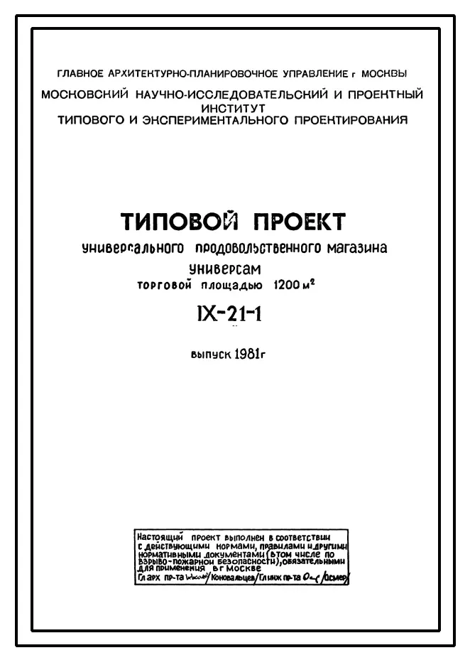 Типовой проект IX-21-1 Универсальный продовольственный магазин «Универсам» общей торговой площадью 1200 м.кв. выпуск 1981 года. Для строительства в г.Москве