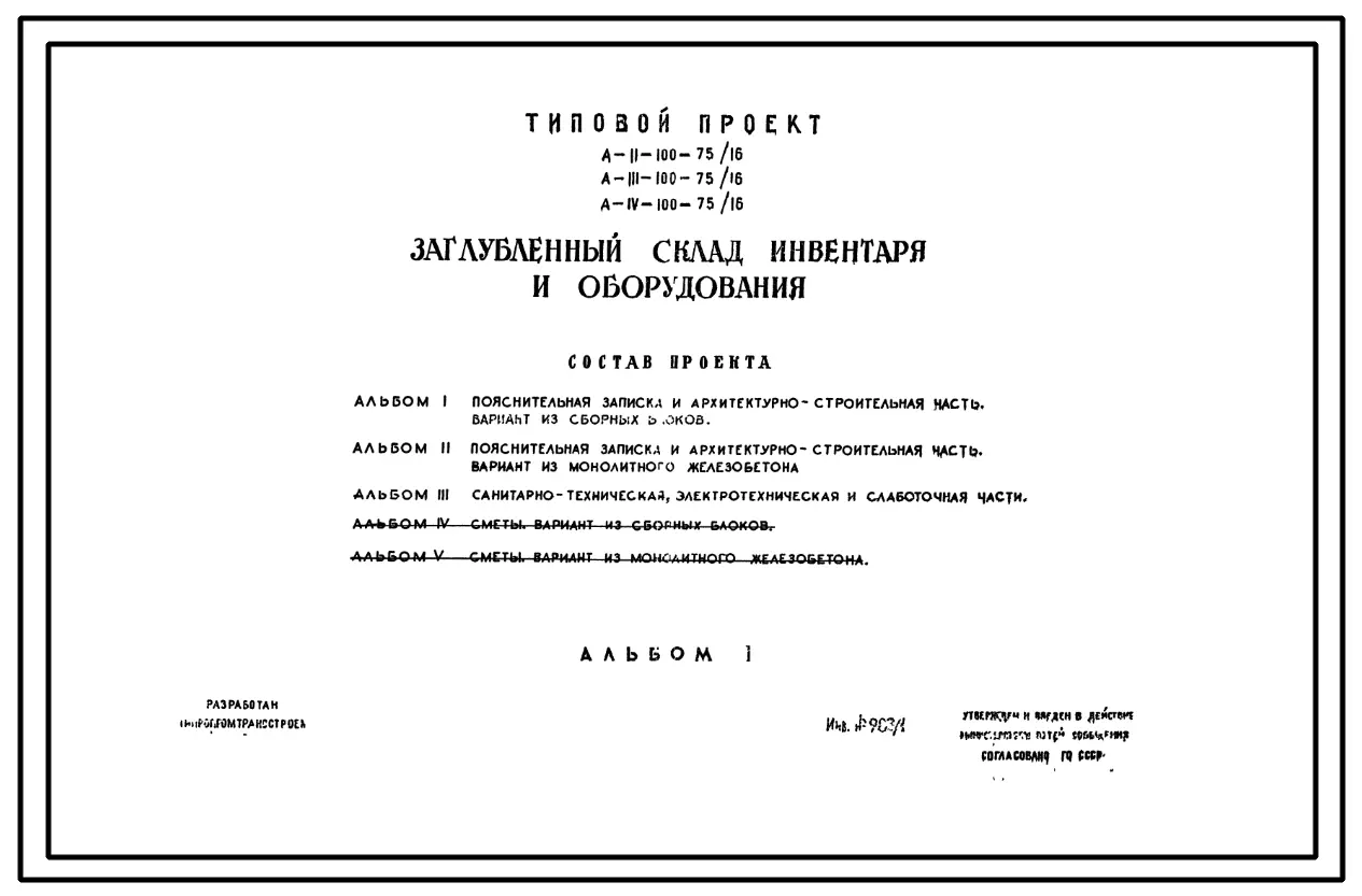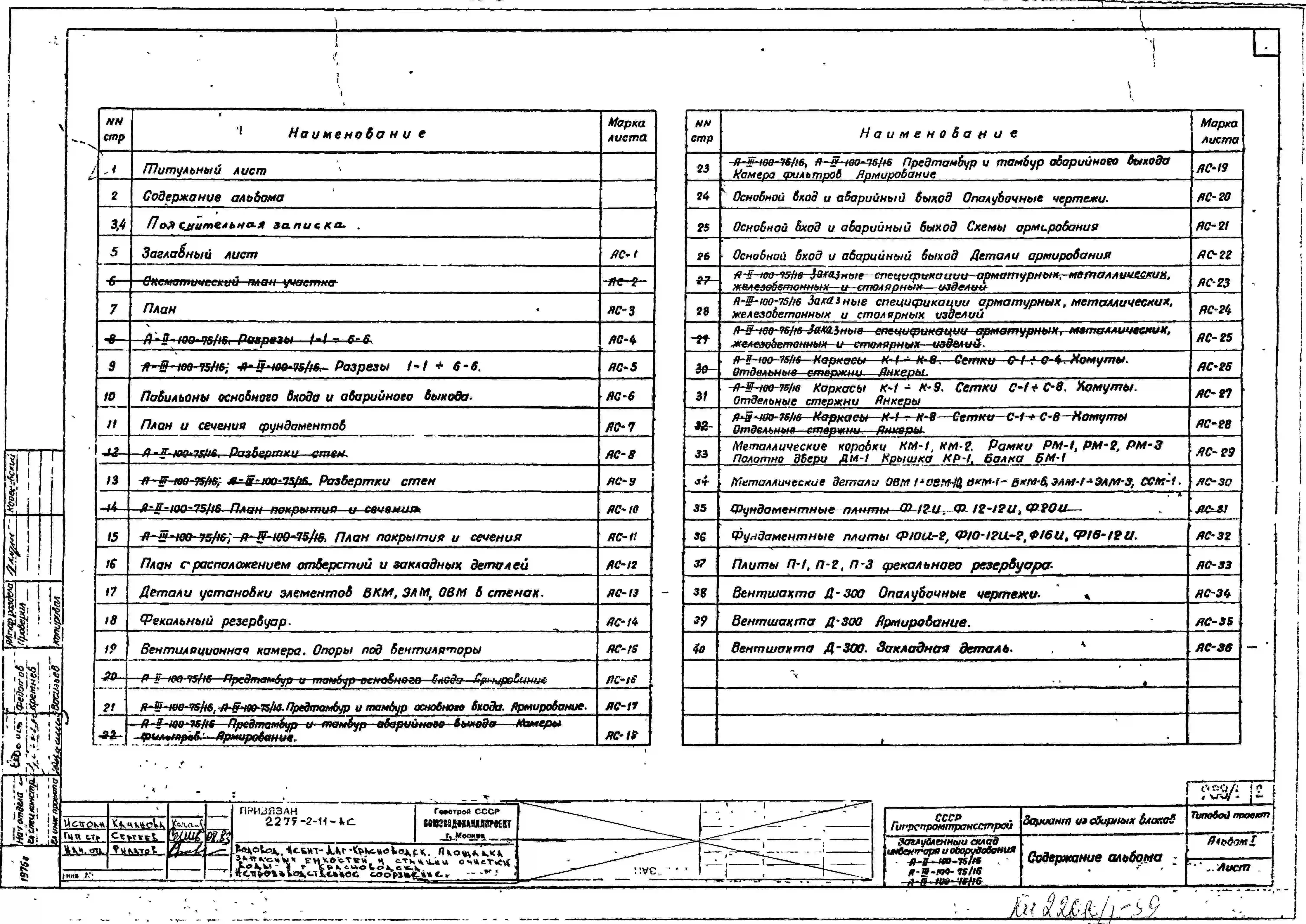 Типовой проект А-II,III,IV-100-75/16 Заглубленный склад инвентаря и оборудования (убежище на 100 человек, размеры убежища 12м на 8м, режимы вентиляции 1,2).