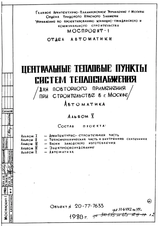 Типовой проект 20-77-7633 Центральные тепловые пункты систем теплоснабжения для строительства в Москве