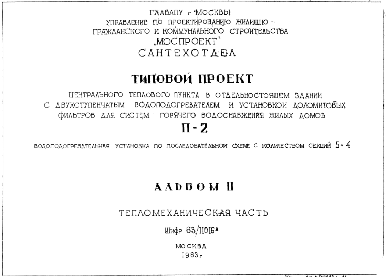 Типовой проект 63/11016 П-2 Центральный тепловой пункт в отдельностоящем здании с двухступенчатым водоподогревателем и установкой доломитовых фильтров для систем горячего водоснабжения жилых домов