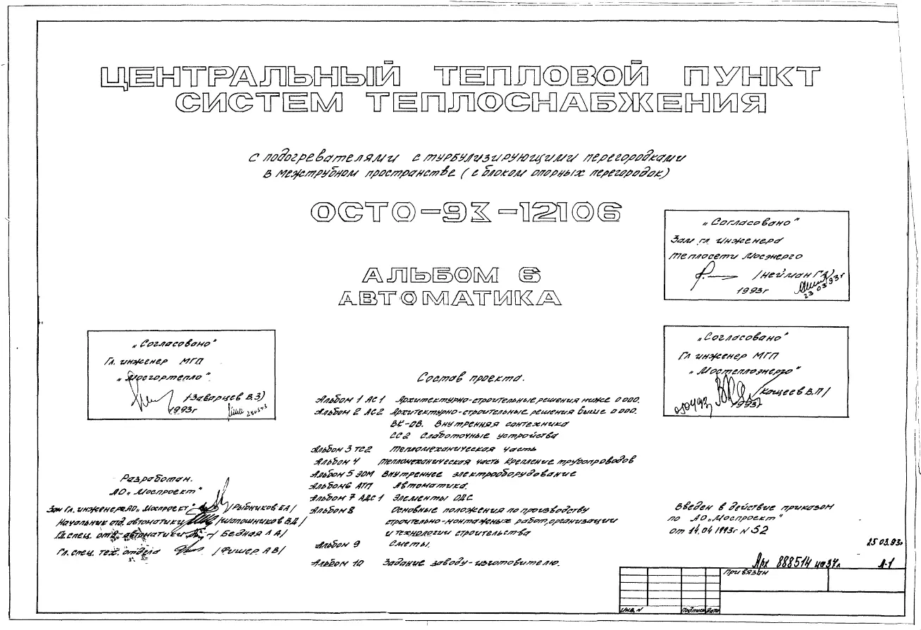 Типовой проект ОСТО-93-12106 Центральный Тепловой Пункт систем теплоснабжения с подогревателями с турбулизирующими перегородками в межтрубном пространстве (с блоком опорных перегородок)