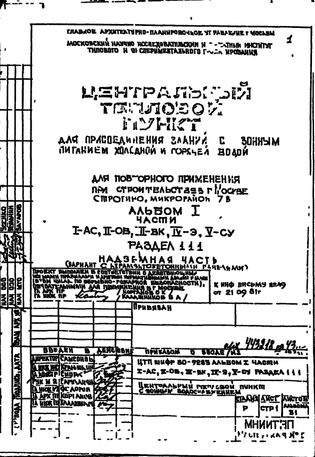 Типовой проект 80-9283 Центральный тепловой пункт для присоединения зданий с зонным питанием холодной и горячей водой
