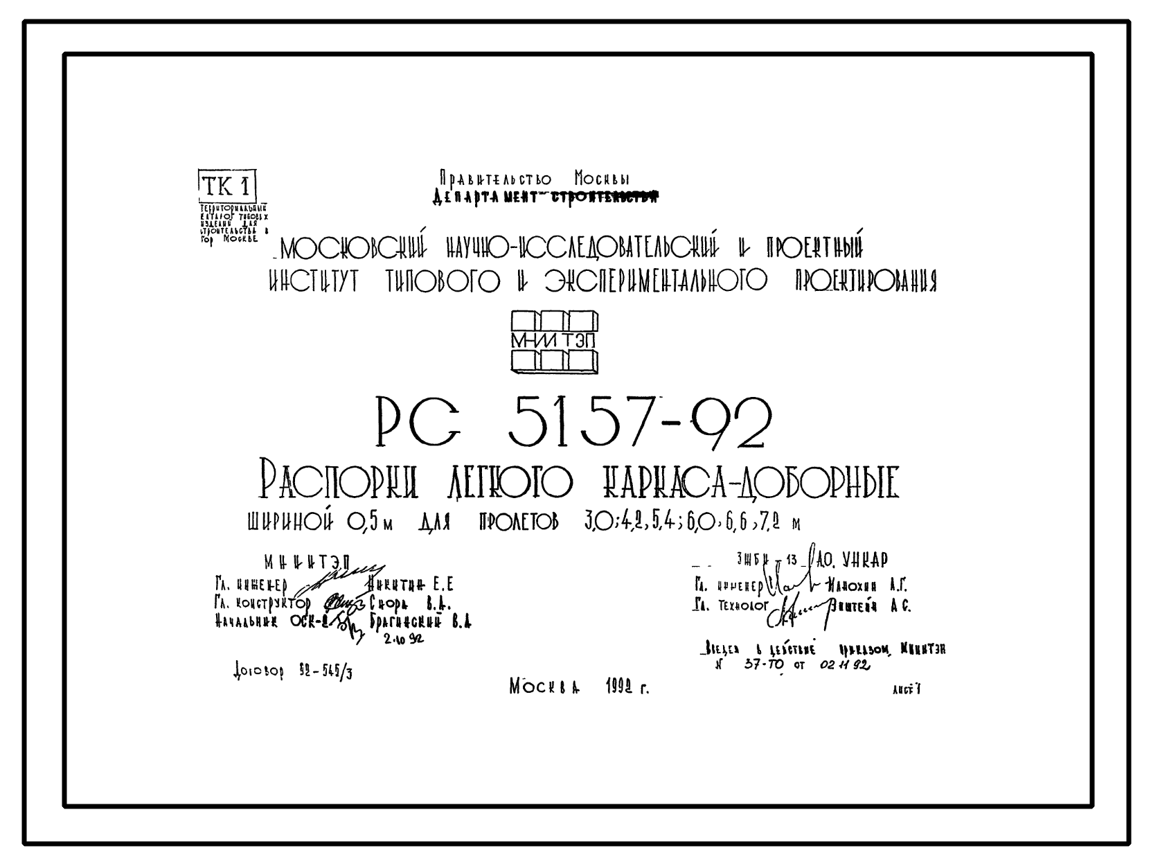 Шифр РС 5157-92 Распорки легкого каркаса-доборные шириной 0,5 м для пролетов 3,0; 4,2; 5,4; 6,0; 6,6; 7,2 м (1992 г.)