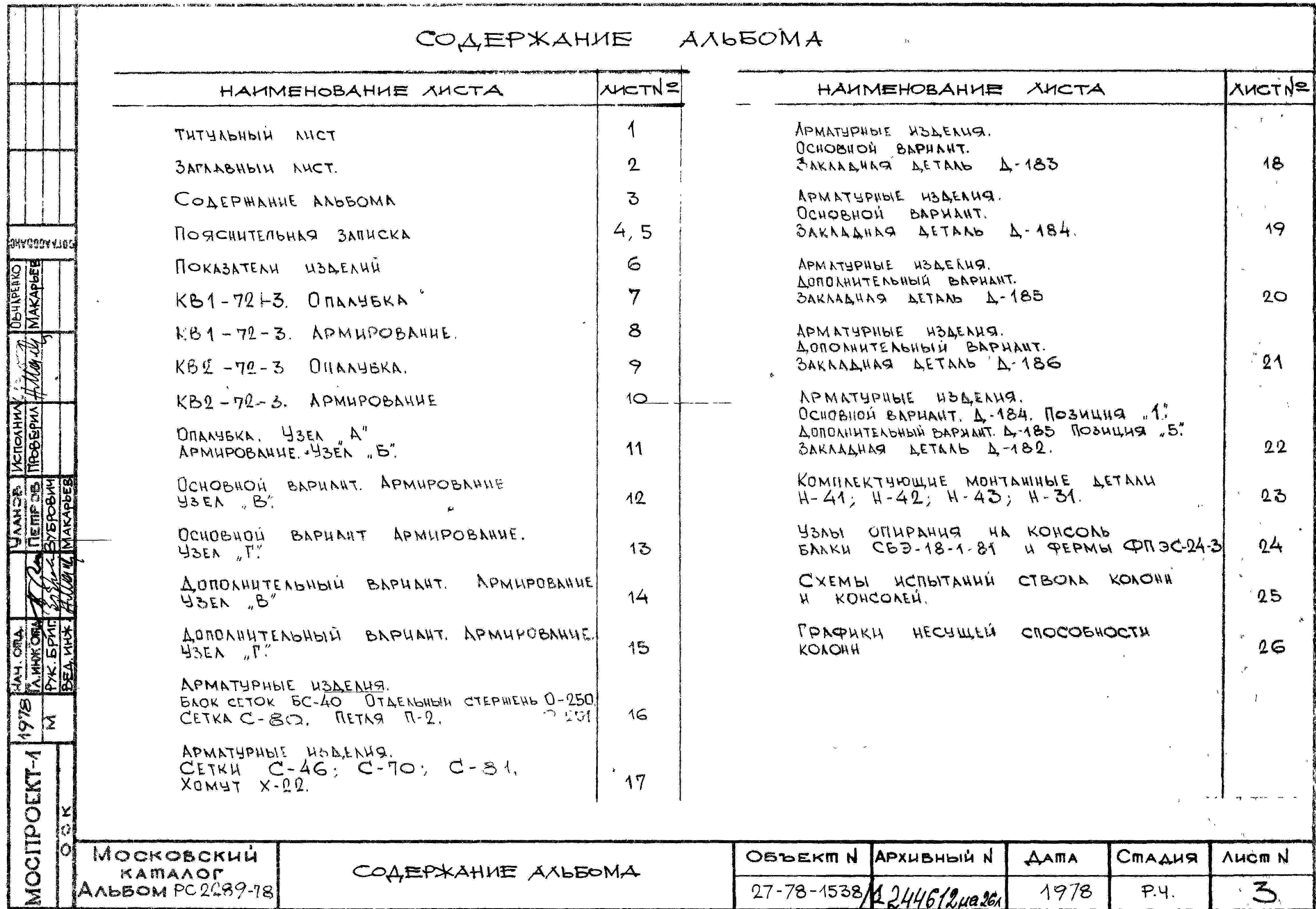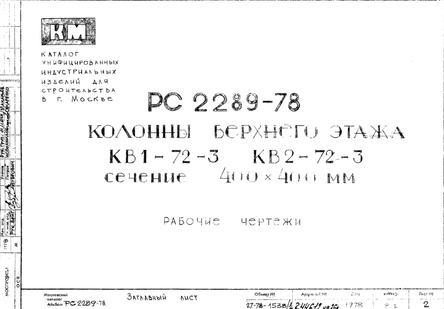 Шифр РС 2289-78 Колонны верхнего этажа КВ1-72-3 КВ2-72-3 сечение 400х400 мм (1978 г.)