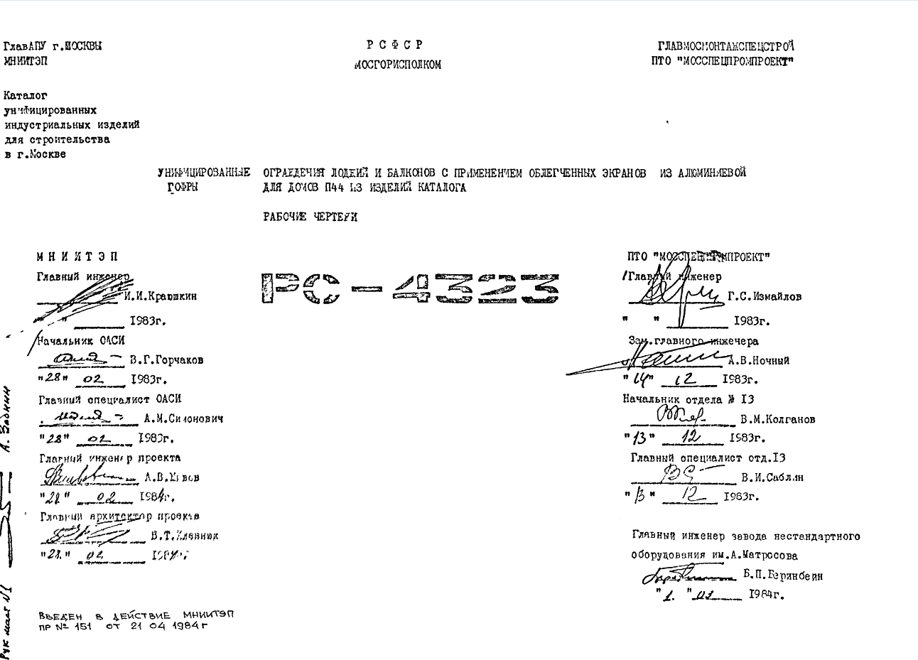 Шифр РС4323 Унифицированные ограждения лоджий и балконов с применением облегченных экранов из алюминиевой гофры для домов П44 из изделий каталога (1984 г.)