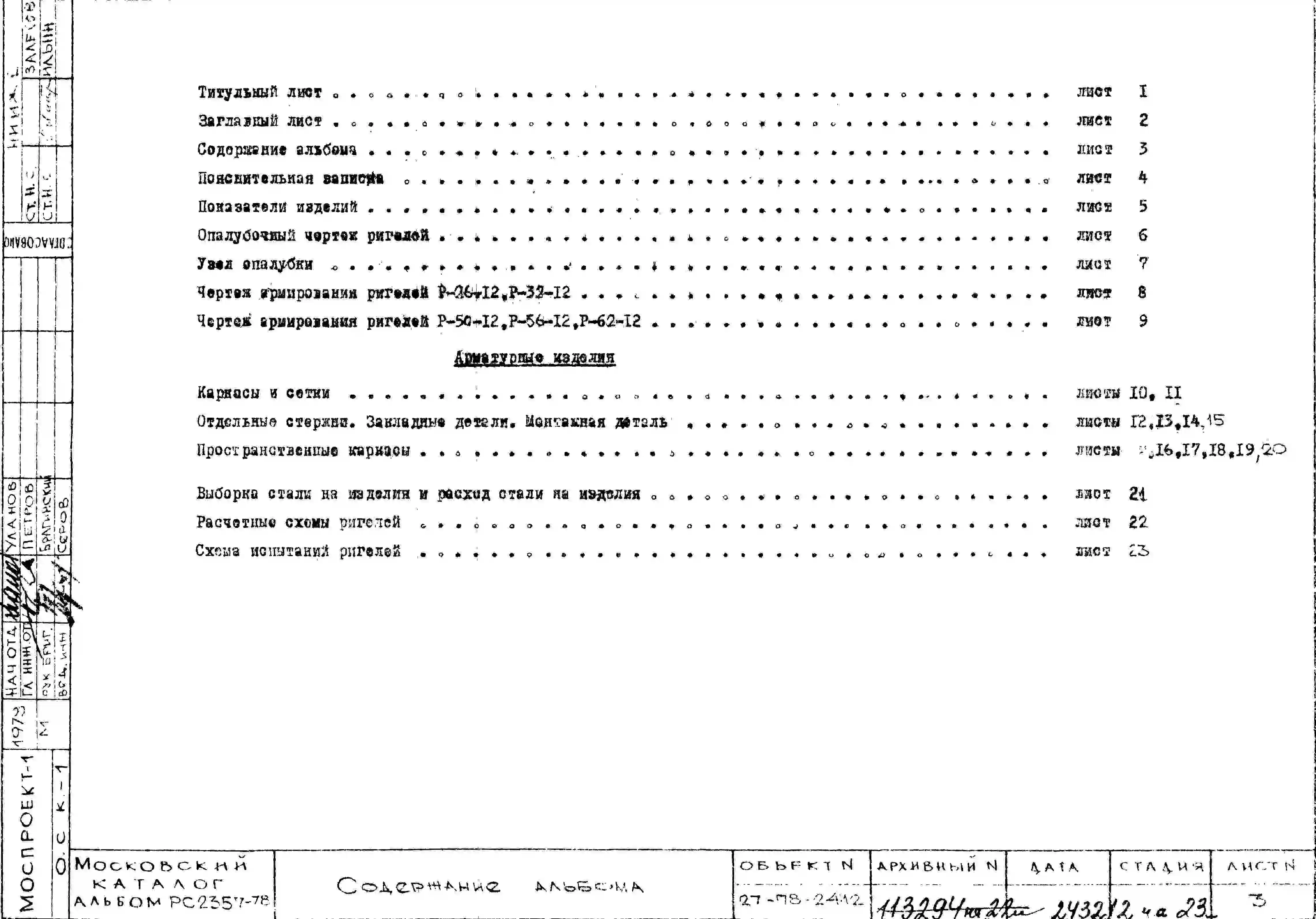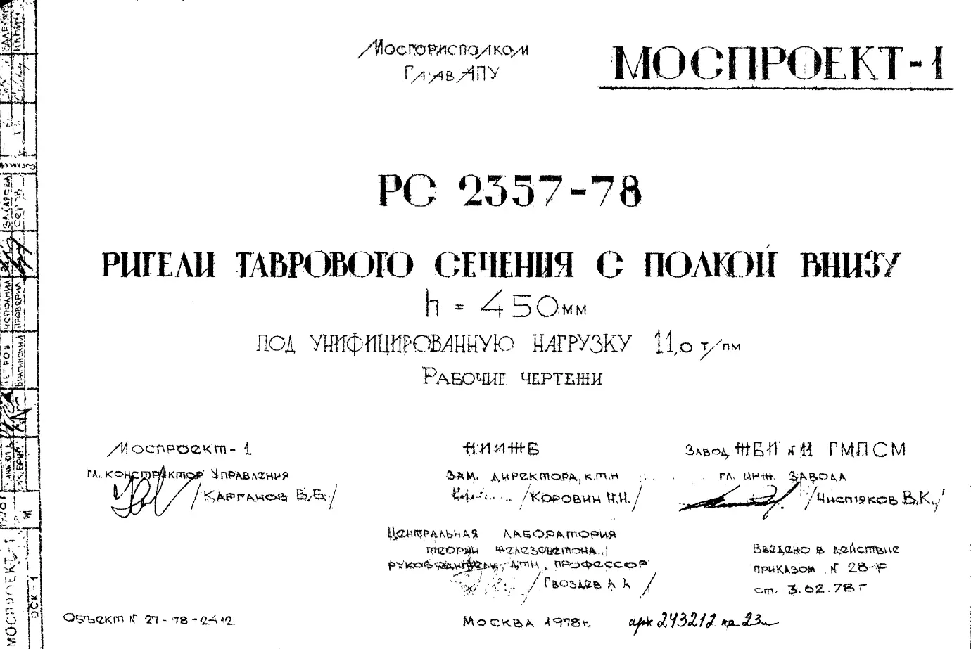 Шифр РС 2357-78 Ригели таврового сечения с полкой внизу h=450 мм под унифицированную нагрузку 11,0 т/пм (1978 г.)