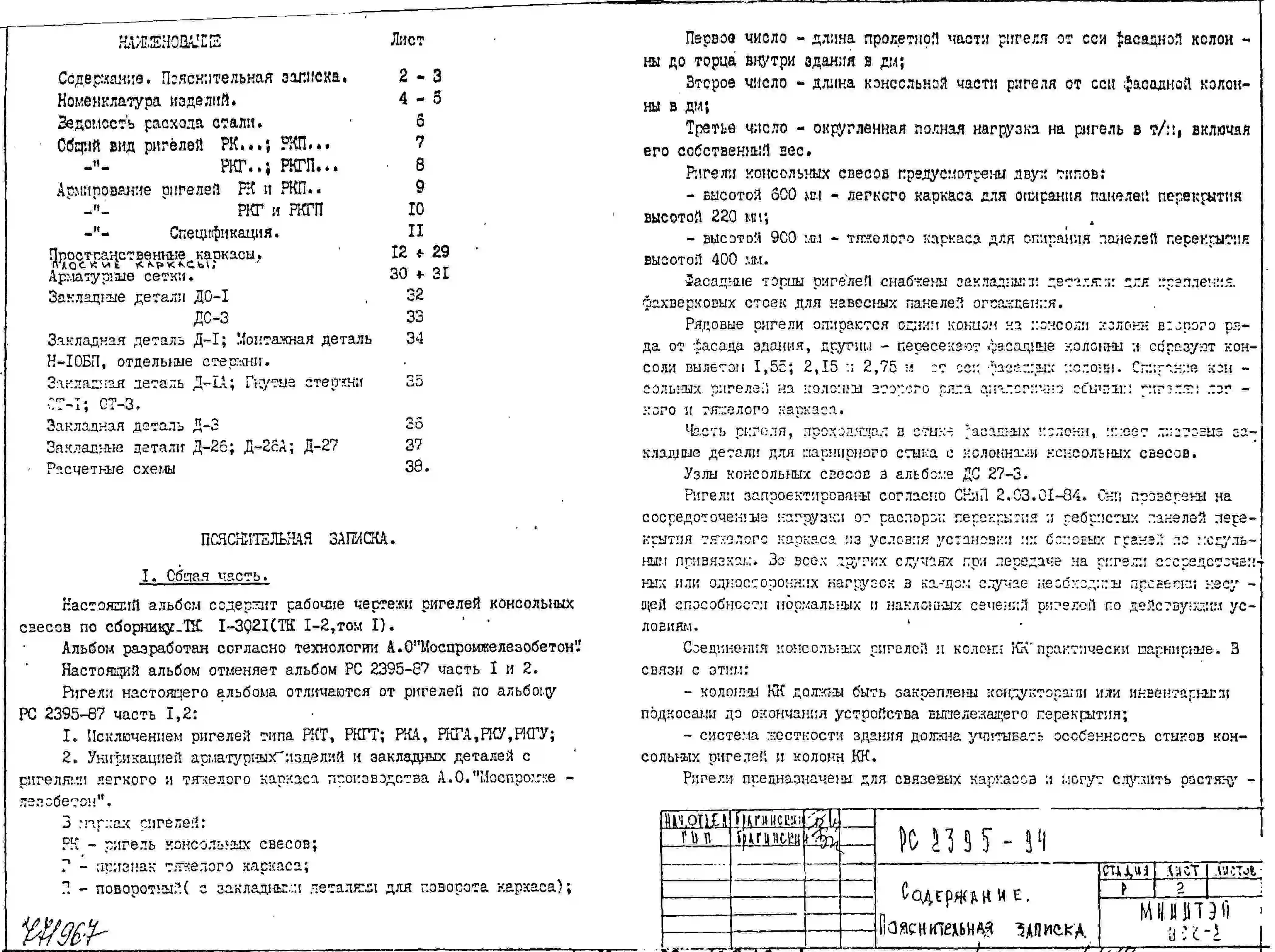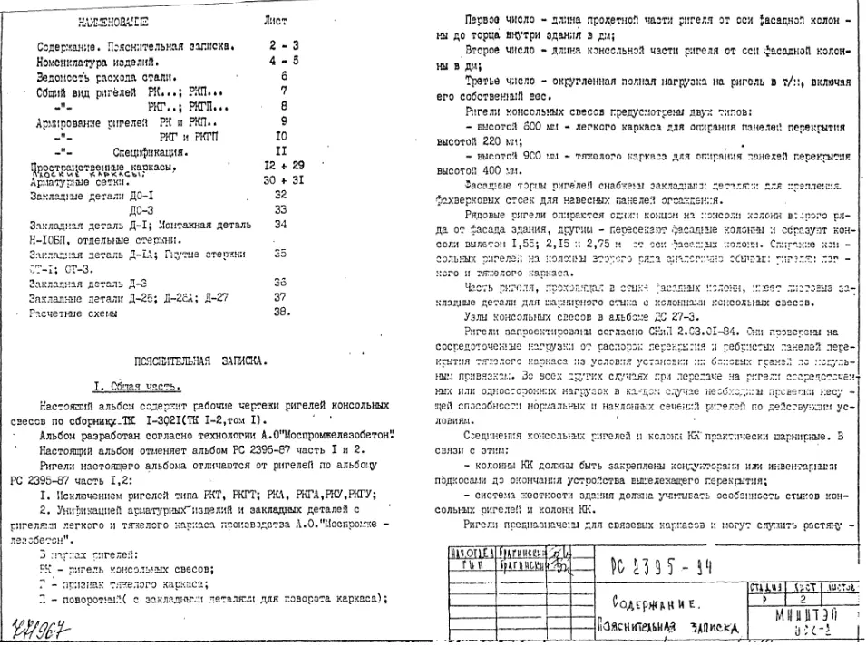Шифр РС 2395-94 Ригели консольных свесов (1987 г.)