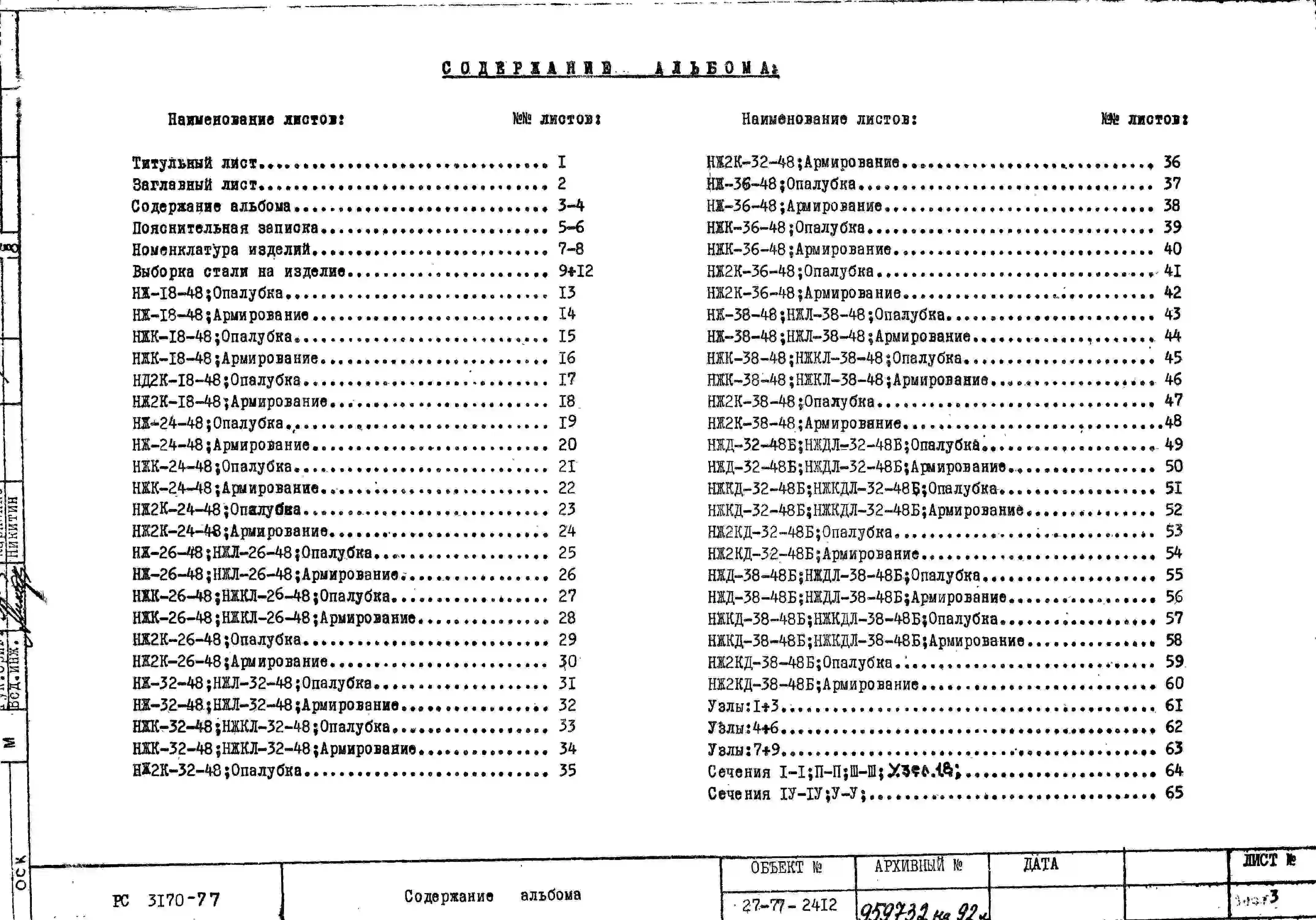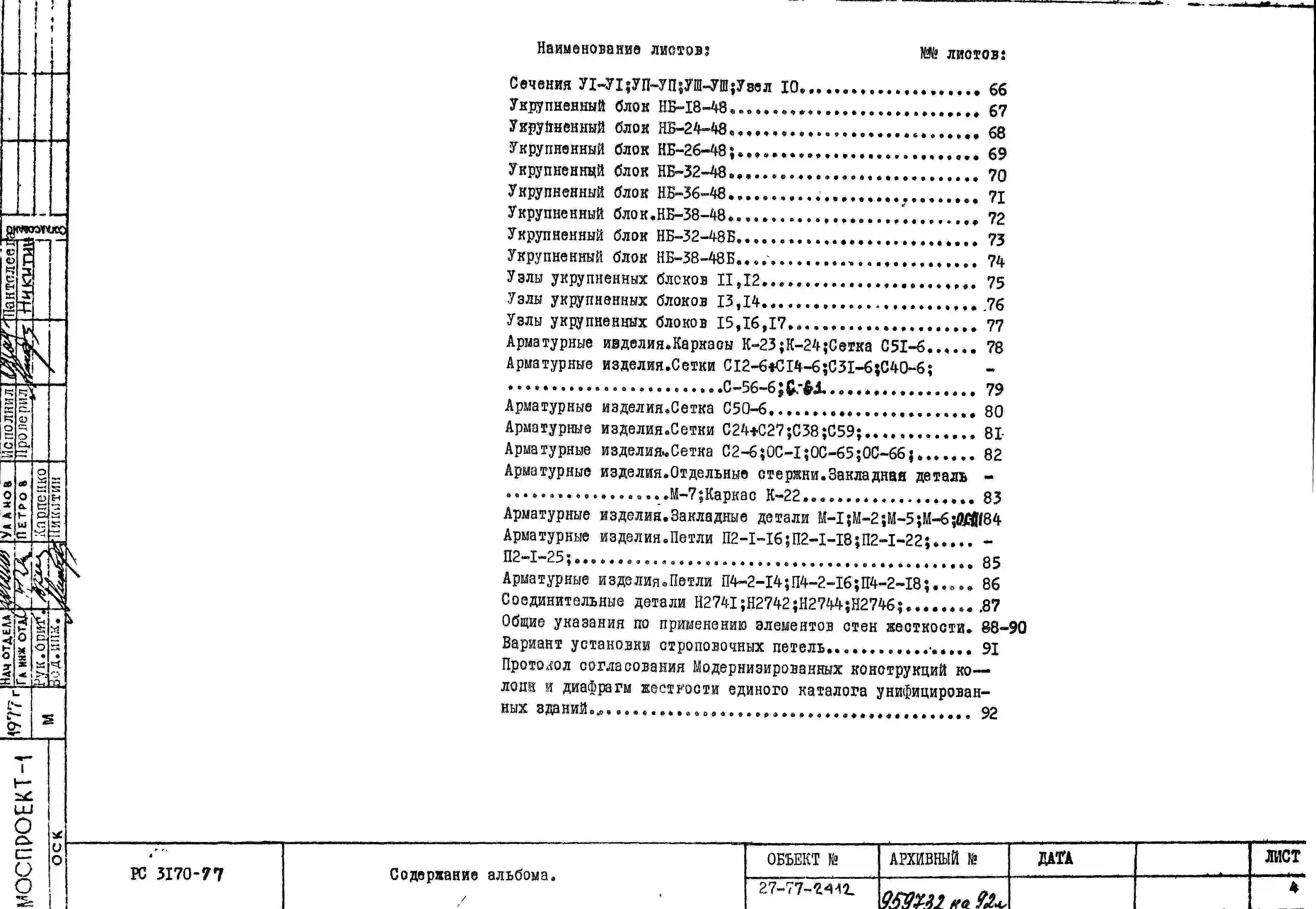 Шифр РС 3170-77 Стены жесткости для высоты этажа 4,8 м (1977 г.)