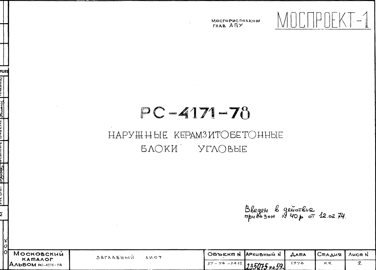 Шифр РС 4171-78 Наружные керамзитобетонные блоки угловые (1974 г.)