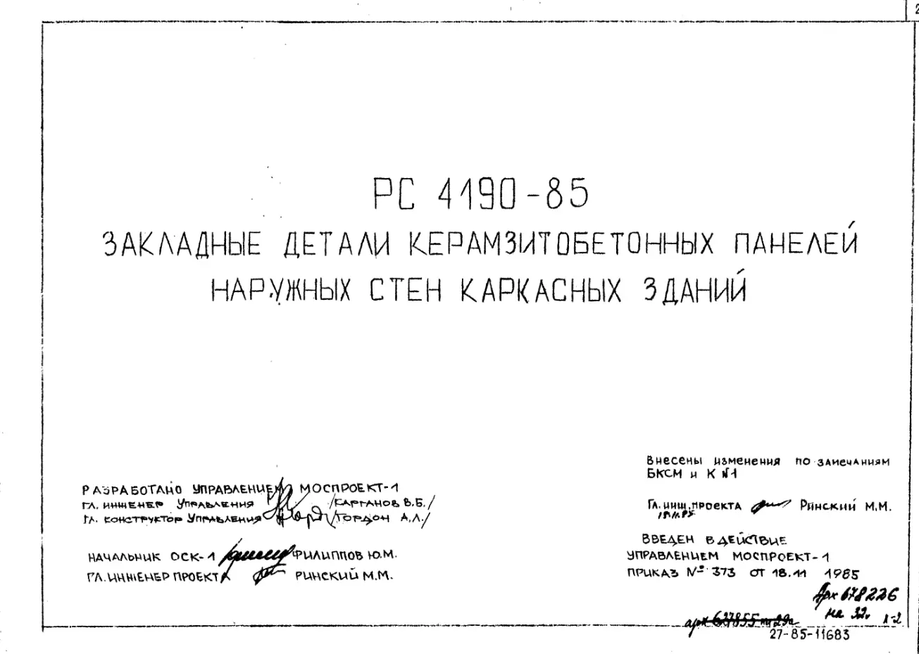 Шифр РС 4190-85 Закладные детали керамзитобетонных панелей наружных стен каркасных зданий (1985 г.)