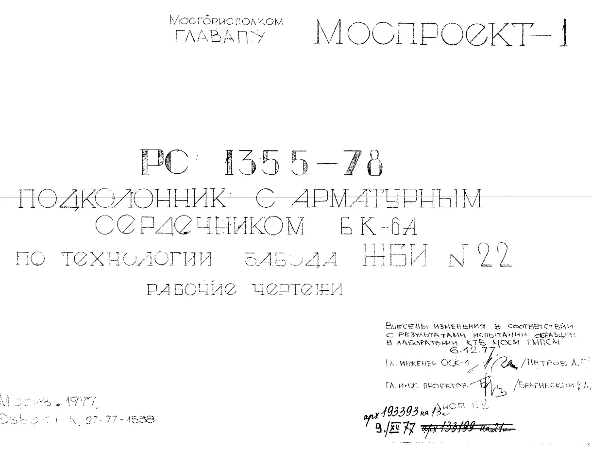 Шифр РС 1355-78 Подколонник с арматурным сердечником БК-6А по технологии завода ЖБИ №22 (1977 г.)