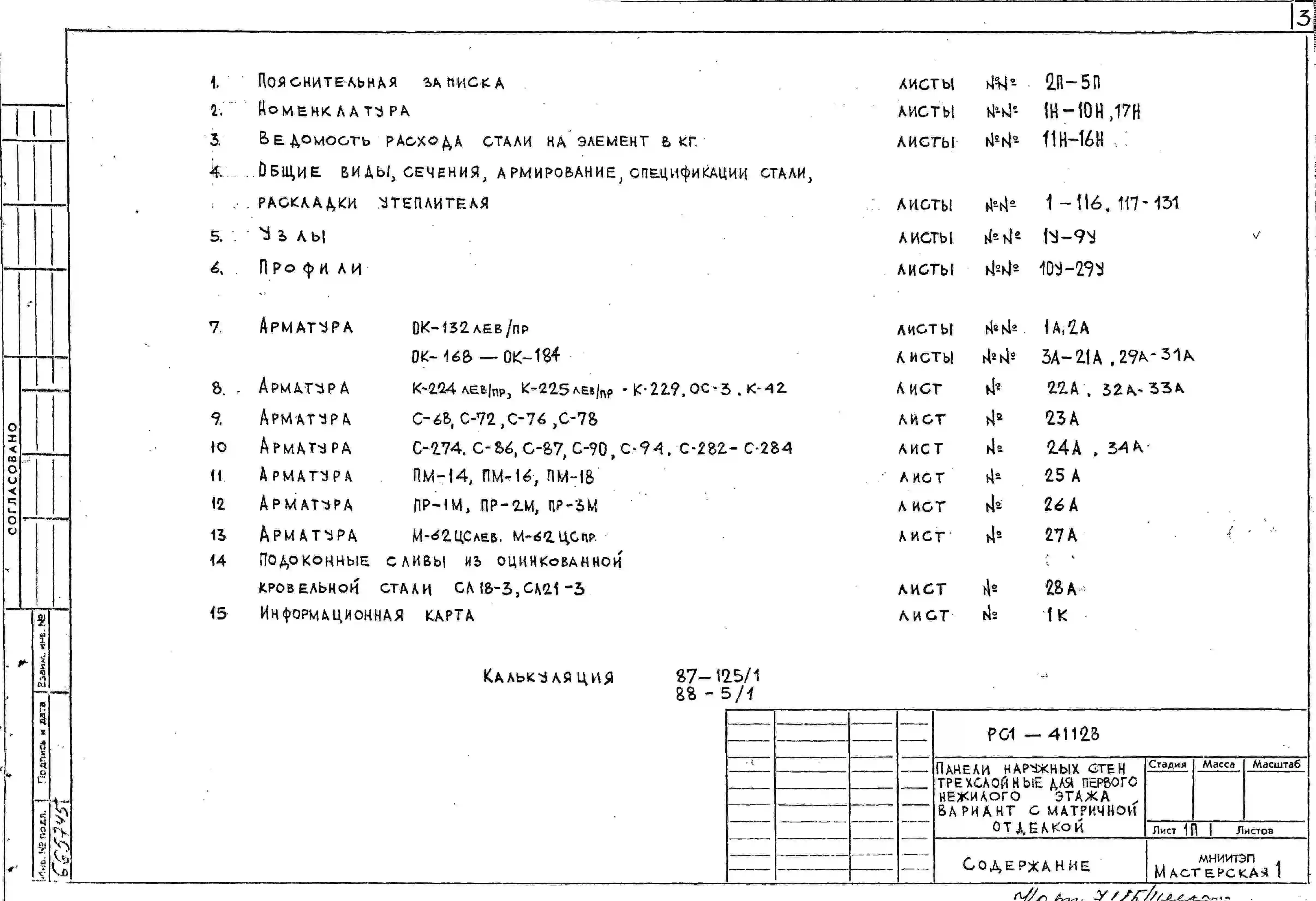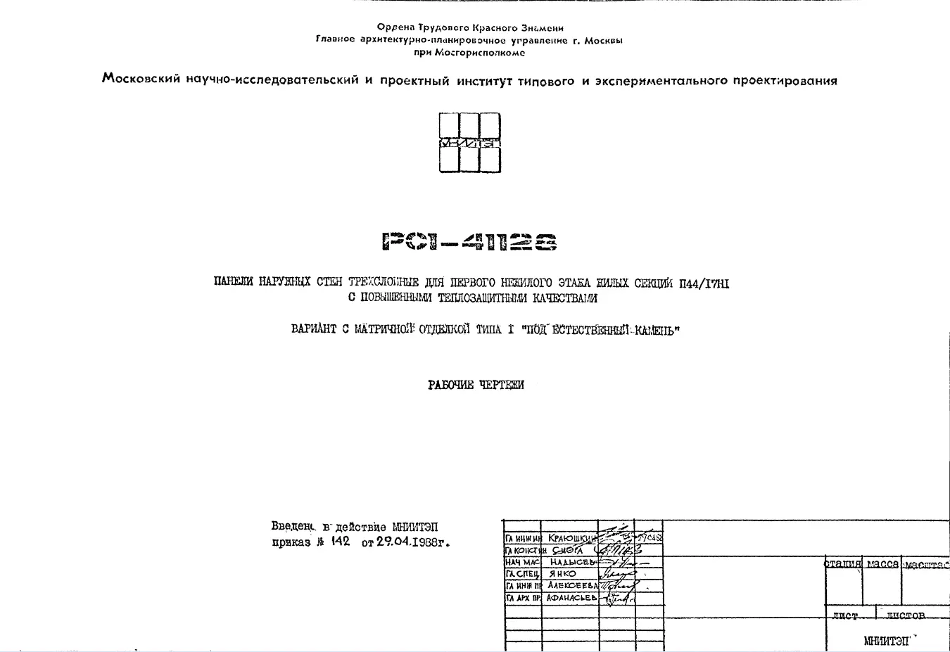 Шифр РС1 41128 Панели наружных стен трехслойные для первого нежилого этажа секций П44/17Н1 с повышенными теплозащитными качествами. Вариант с матричной отделкой типа 1 "под естественный камень" (1988 г.)