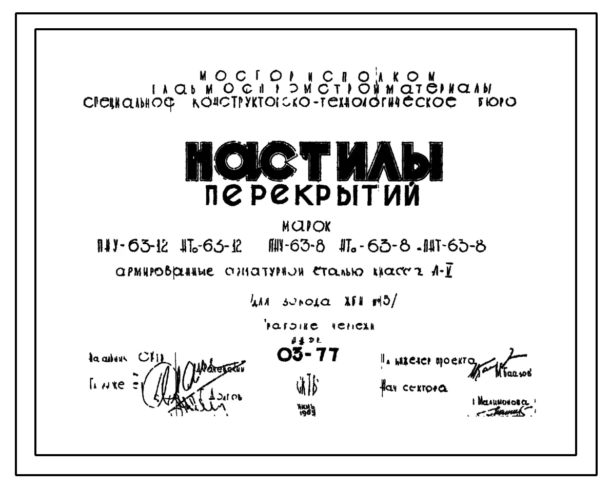 Шифр 03-77 Настилы перекрытий марок ПНУ-63-12, НТо-63-12, ПНУ-63-8. НТо-63-8, ПНТ-63-8 армированные арматурной сталью класса А-V. СКТБ. 1969 год