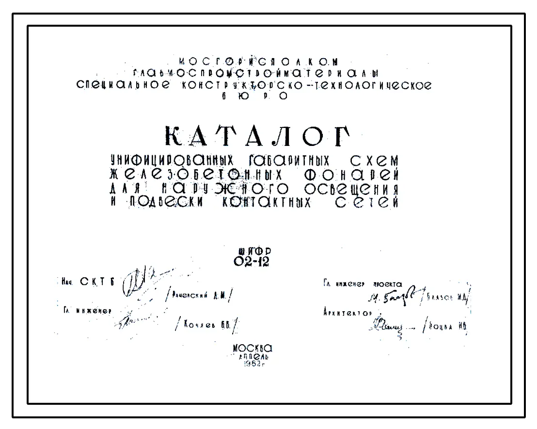 Шифр 02-12 Каталог унифицированных габаритных схем железобетонных фонарей для наружного освещения и подвески контактных сетей. СКТБ. 1962 год.