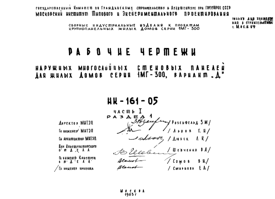 Шифр НК-161-05 Наружные многослойные стеновые панели для жилых домов серии 1МГ-300, вариант "Д" (1963 г.)