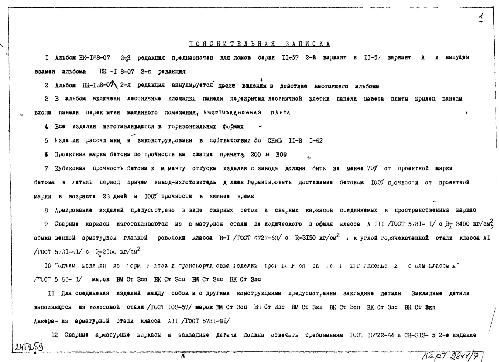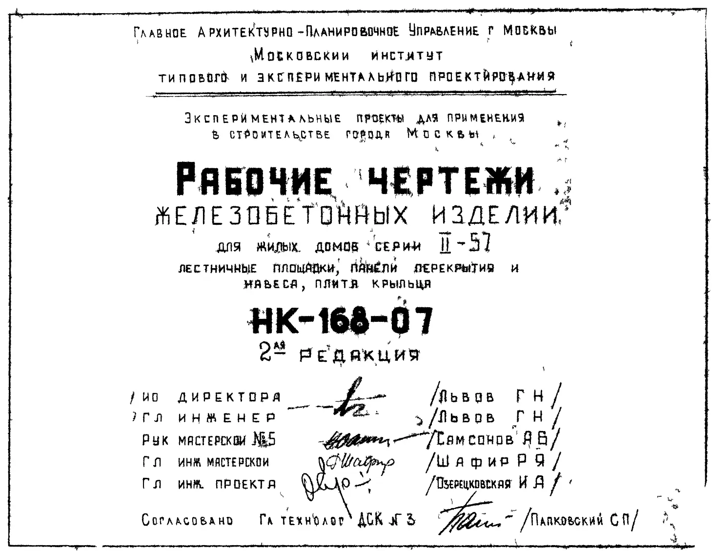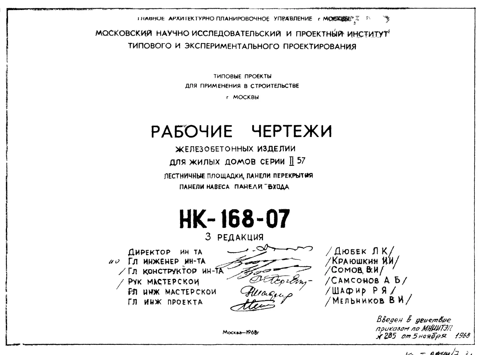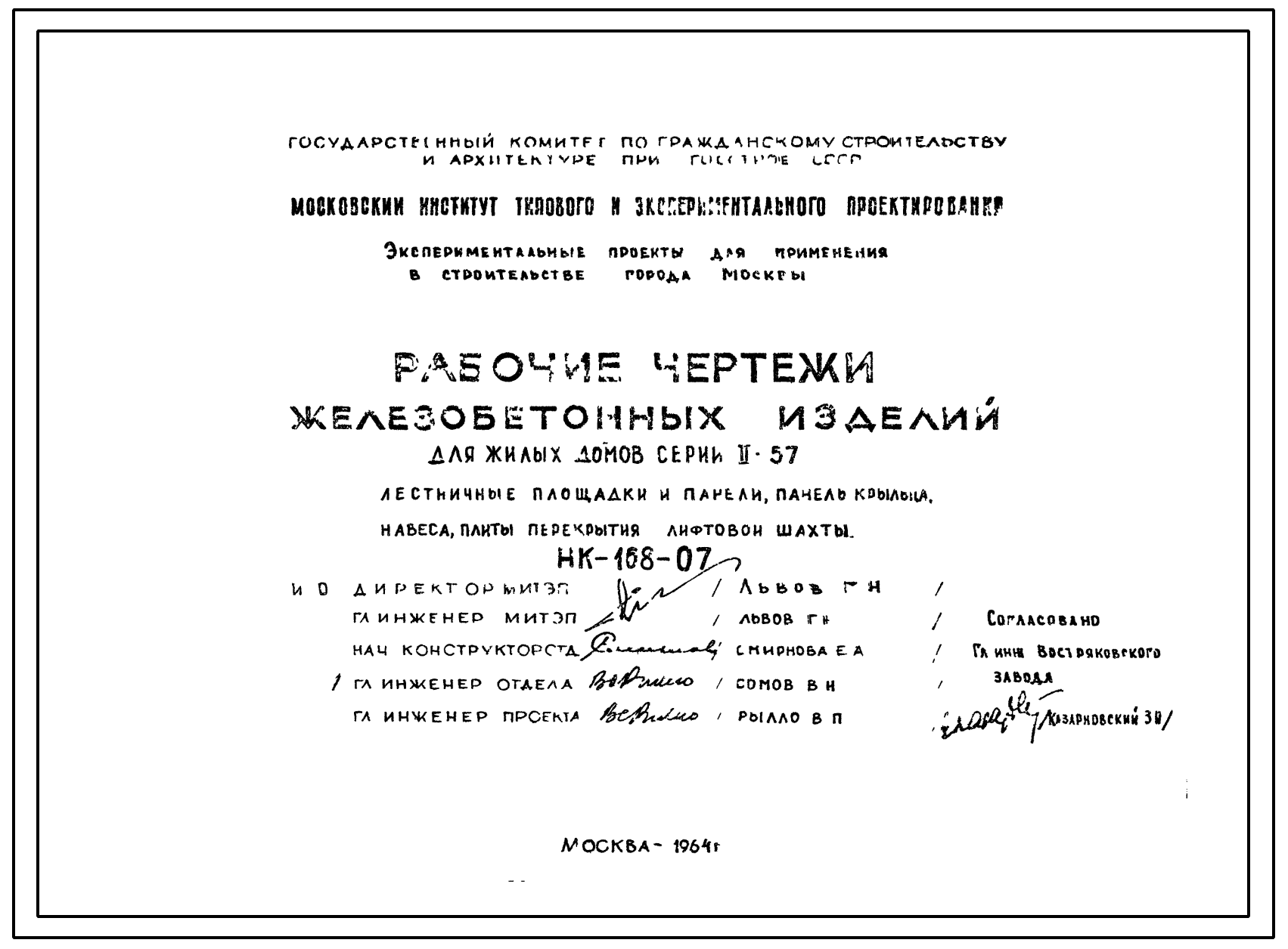 Шифр НК-168-07 Железобетонные изделия для жилых домов серии II-57 лестничные площадки и панели, панель крыльца, навеса, плиты перекрытия лифтовой шахты (1964 г.)