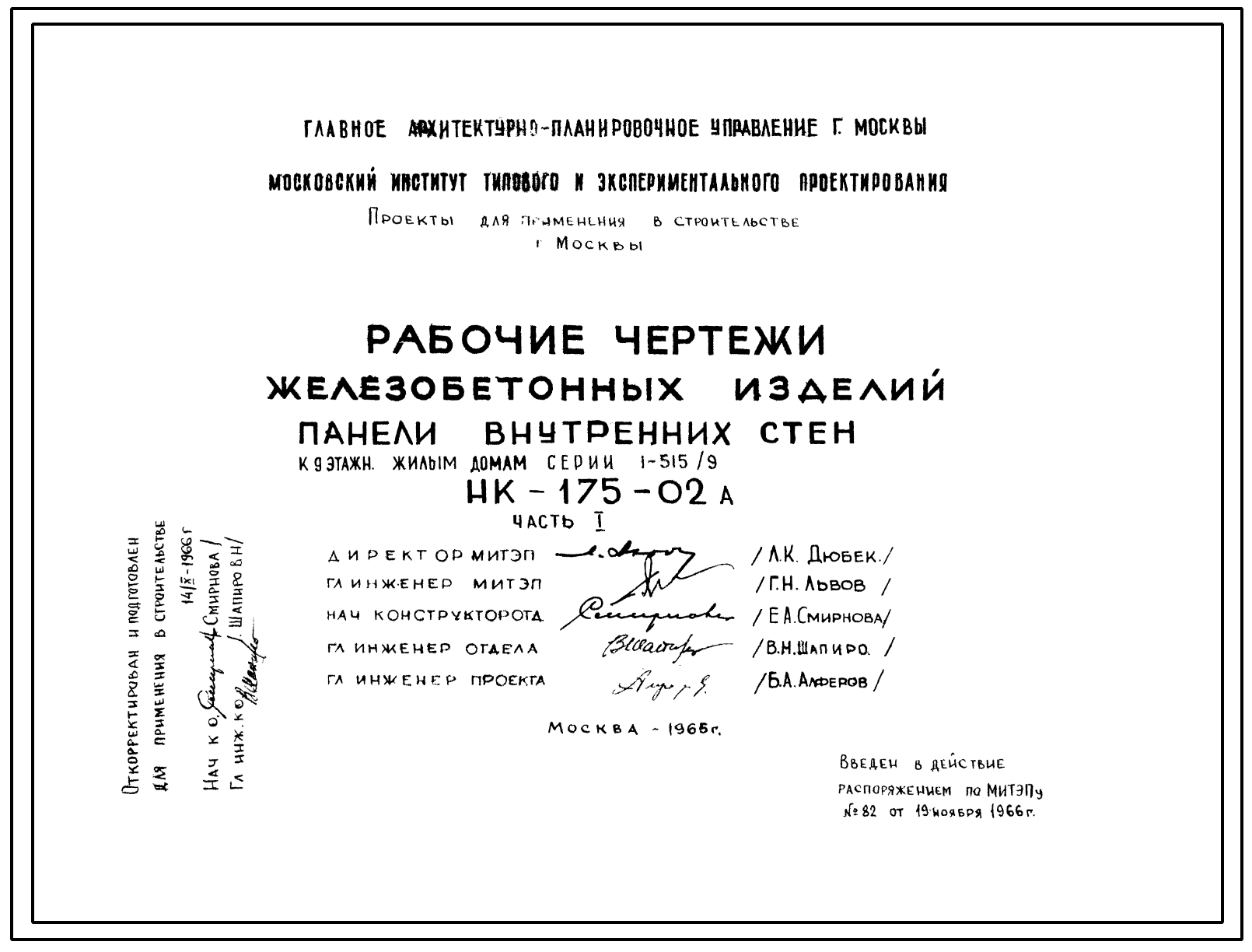 Шифр НК-175-02А Железобетонные изделия. Панели внутренних стен к 9 этажным жилым домам серии 1-515/9 (1966 г.)