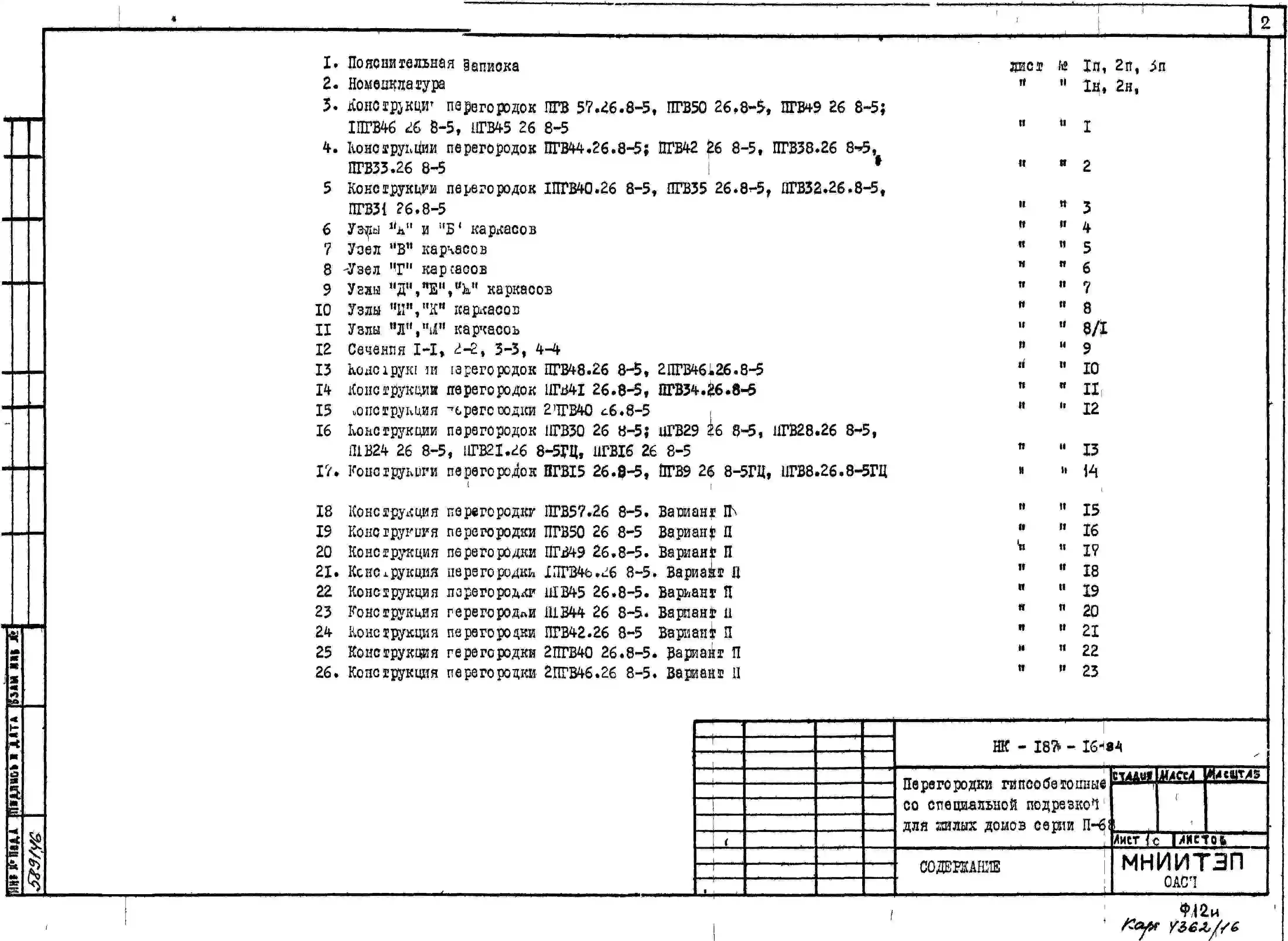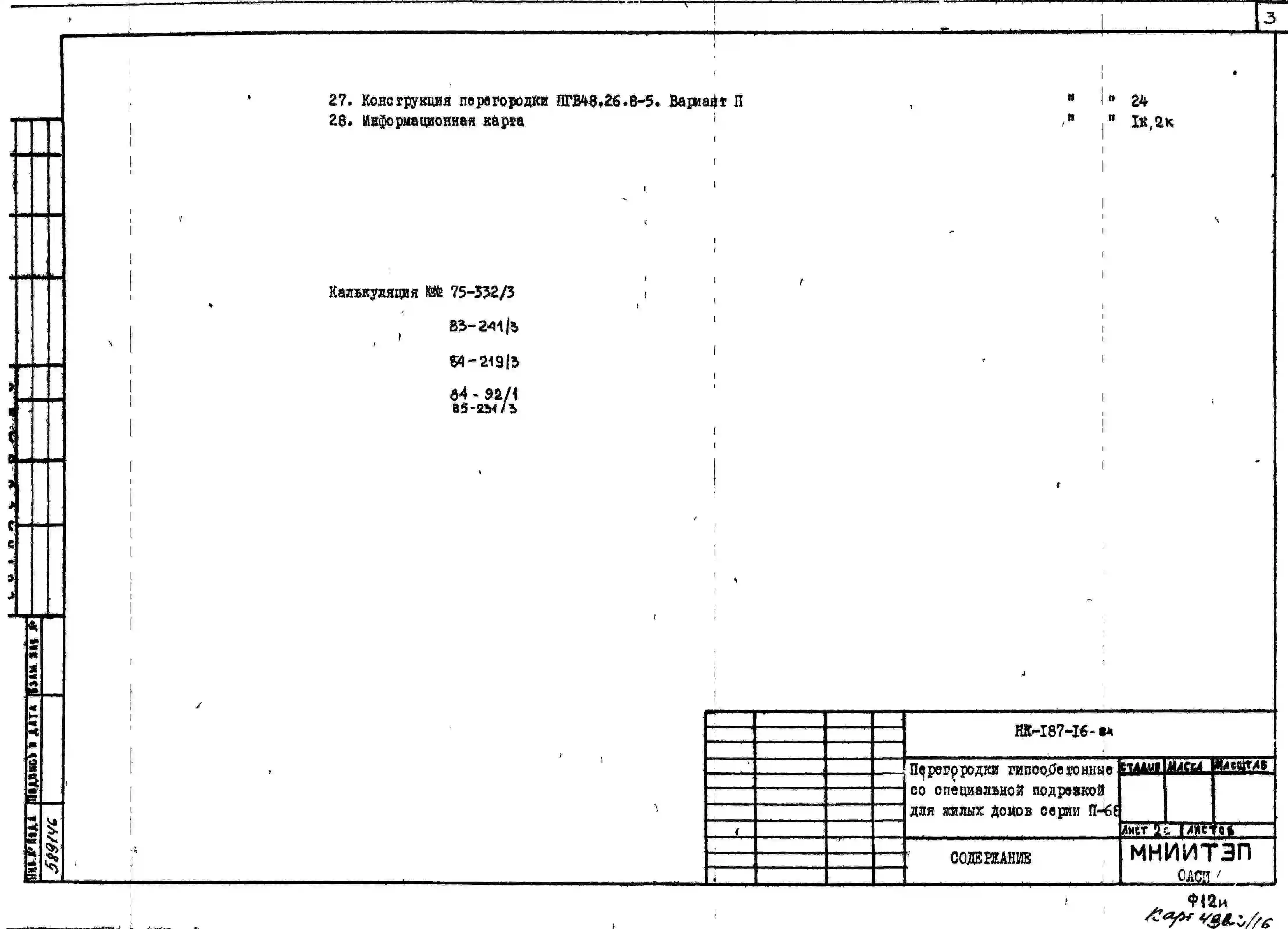 Шифр НК-187-16 Перегородки гипсобетонные со специальной подрезкой для жилых домов серии II-68 (1976 г.)