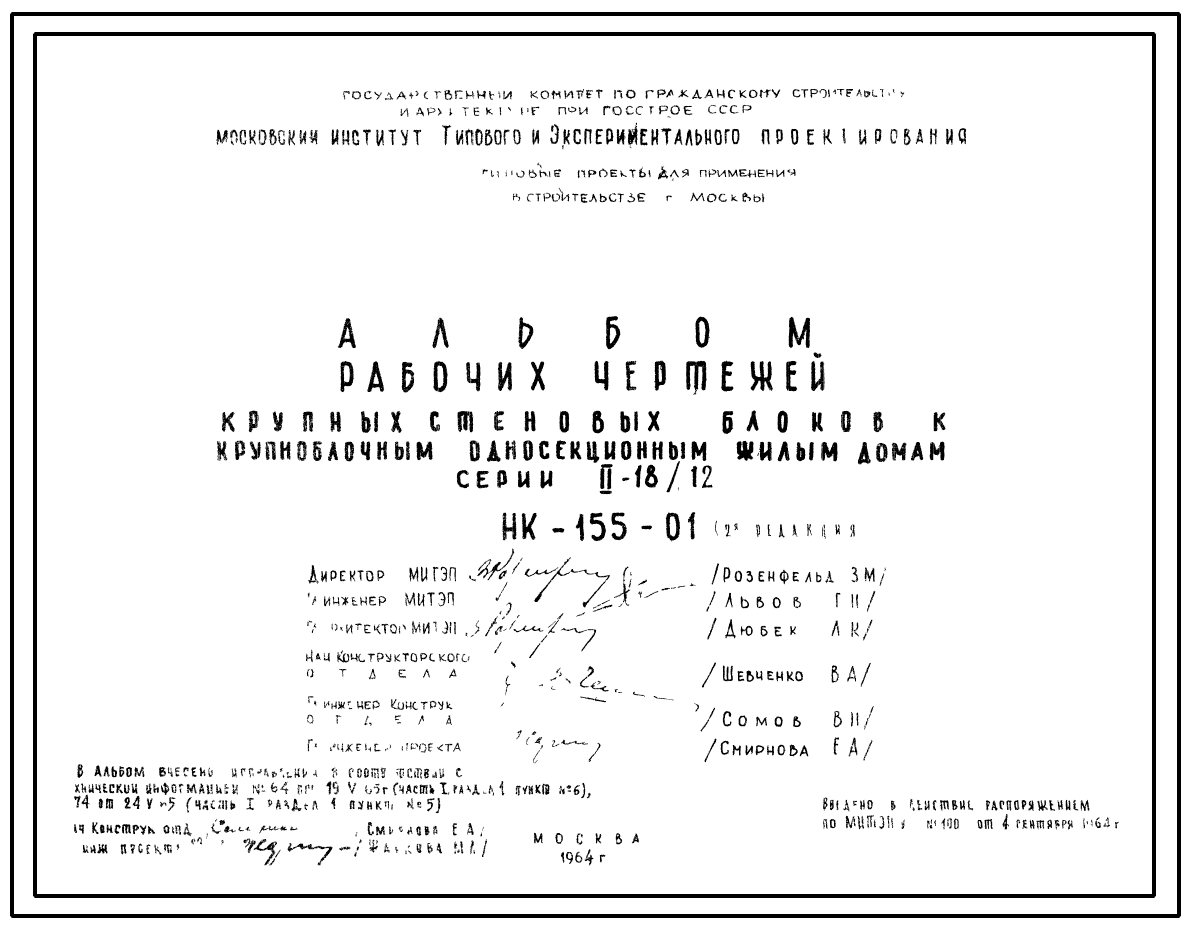 Шифр НК-155-01 Рабочие чертежи крупных стеновых блоков к крупноблочным односекционным жилым домам серии II-18/12. Редакция 2 (1964 г.)