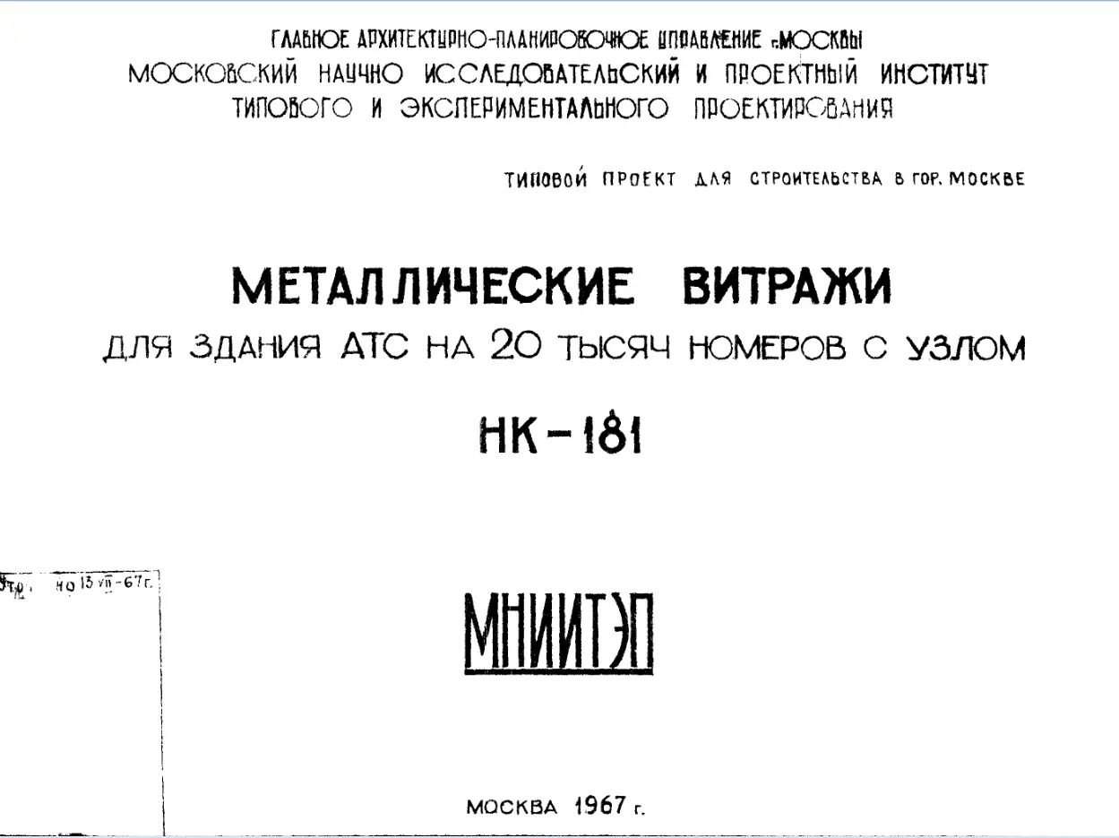 Шифр НК-181 Металлические витражи для здания АТС на 20 тысяч номеров с узлом (1967 г.)
