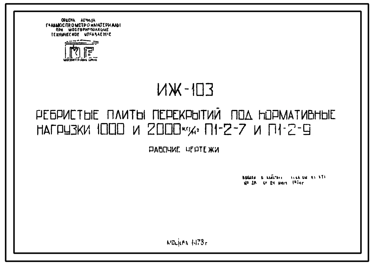 Шифр ИЖ 103 Ребристые плиты перекрытий под нормативные нагрузки 1000 и 2000 кг/м.кв. Марки плит П1-2-7 и П1-2-9.