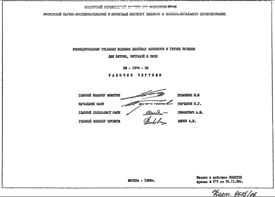 Шифр РМ-1974-05 Унифицированные стальные изделия линейных элементов и глухих вставок для витрин, витражей и окон (1989 г.)