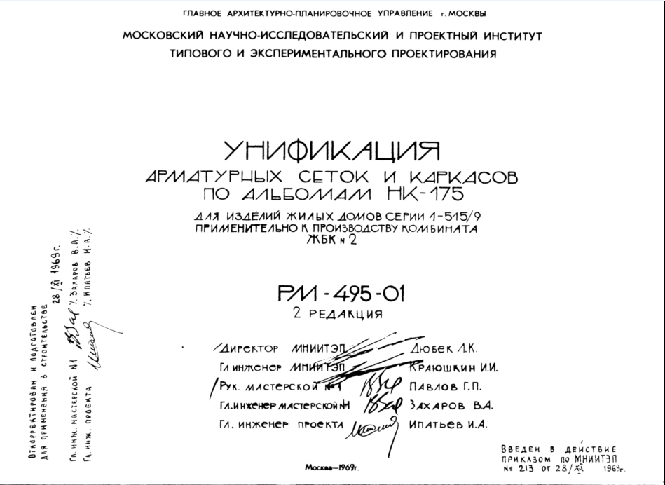 Шифр РМ-495-01 Унификация арматурных сеток и каркасов по альбомам НК-175. Для изделий жилых домов серии 1-515/9 приментильно к производству комбината ЖБК № 2 (1969 г.)