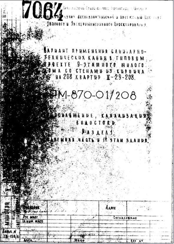 Шифр РМ-870-01/208 Вариант применения санитарно-технических кабин в типовом проекте 9-этажного жилого дома со стенами из кирпича на 208 квартир II-29-208