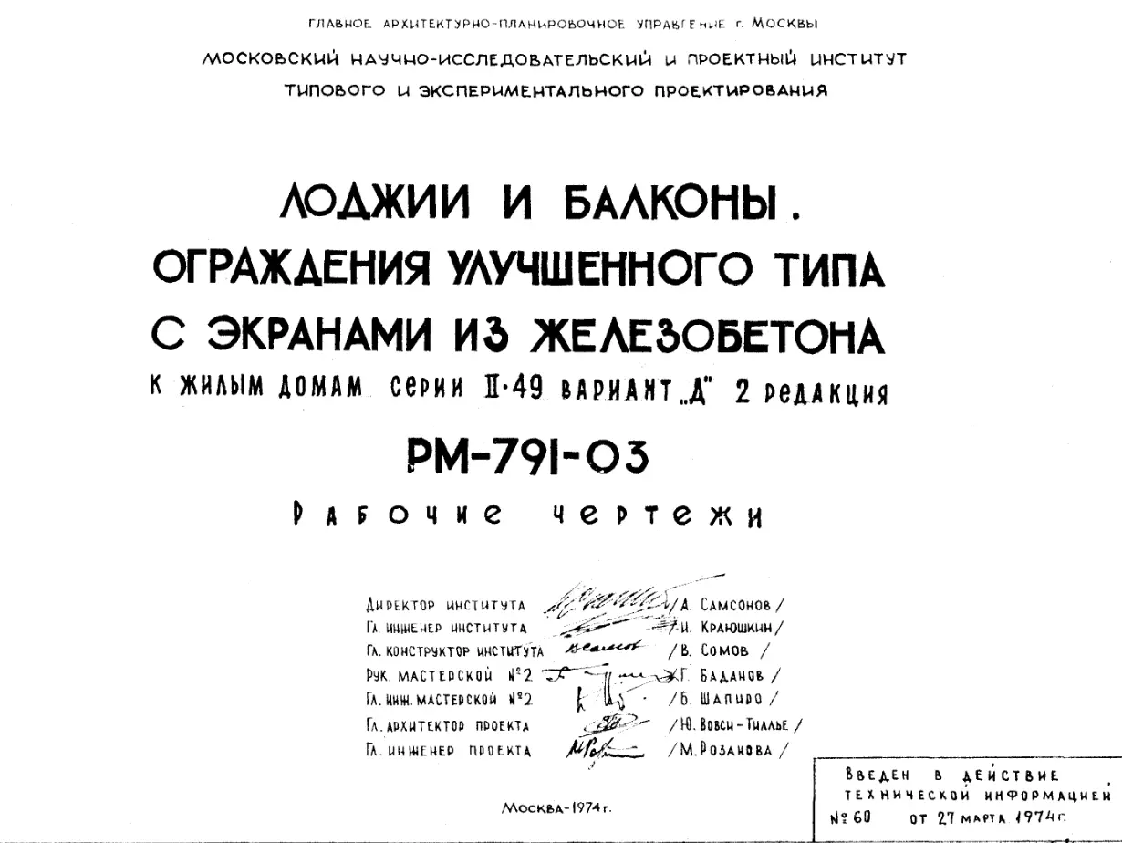 Шифр РМ-791-03 Лоджии и балконы. Ограждения улучшенного типа с экранами из железобетона к жилым домам серии II-49 вариант "Д" (1974 г.)